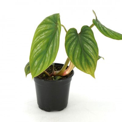 Philodrendron mamei stands out with large, heart-shaped leaves. The leaves are a deep green, adorned with silvery-white variegation and prominent veins that give them a textured appearance. The underside of the leaves are a lighter green.