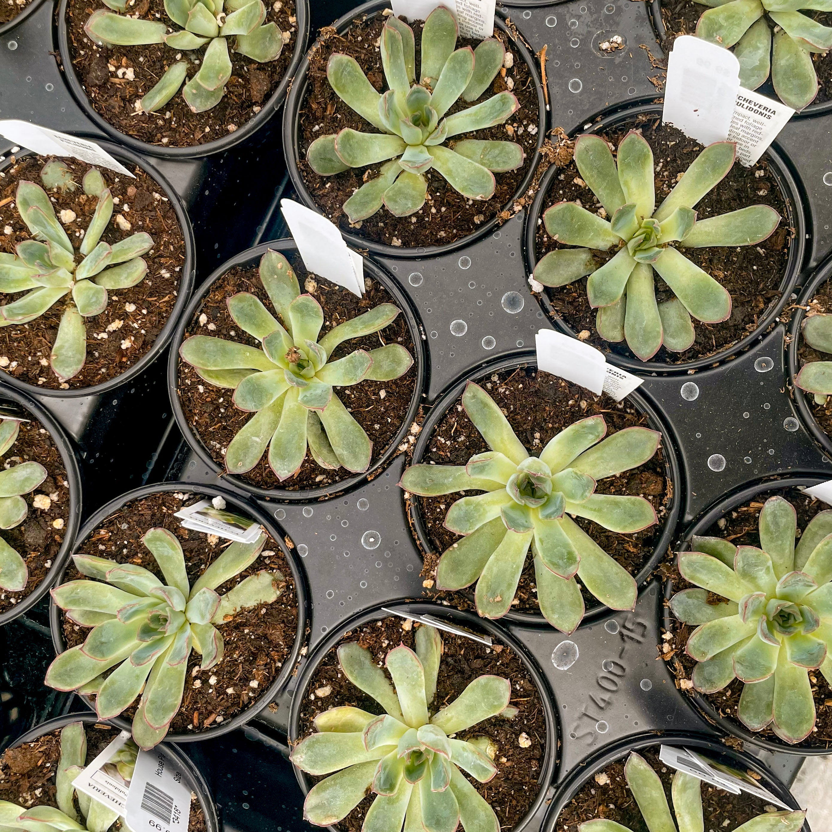 In spring, bright yellow flowers emerge on multiple, unbranched reddish stems that gracefully bend under the weight of the blooms, creating a vivid contrast against its cool foliage. Thriving in full sun and well-drained soil, Echeveria pulidonis is a low-maintenance, eye-catching addition to any succulent collection.