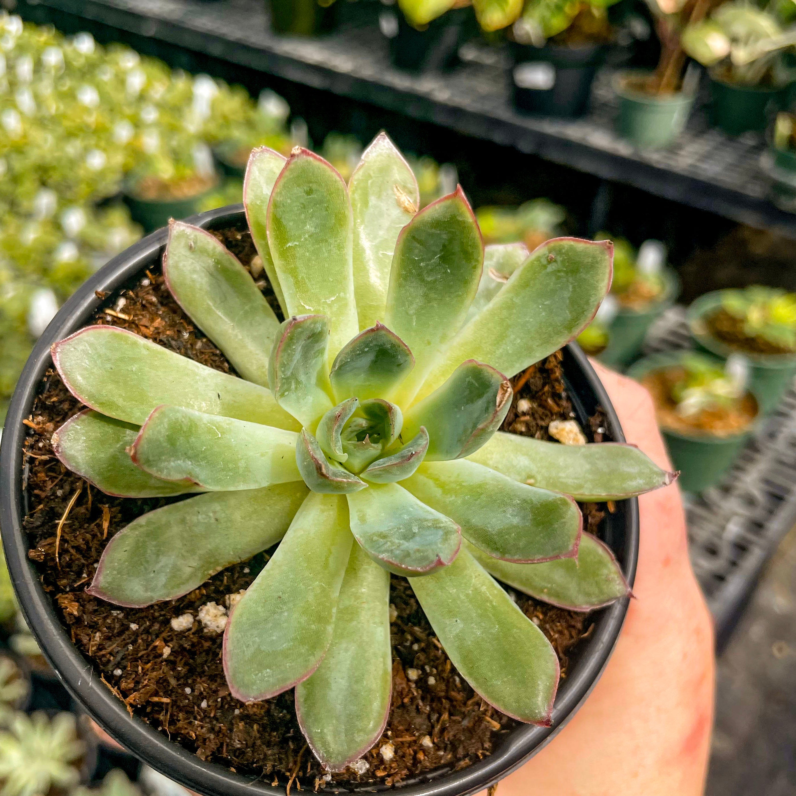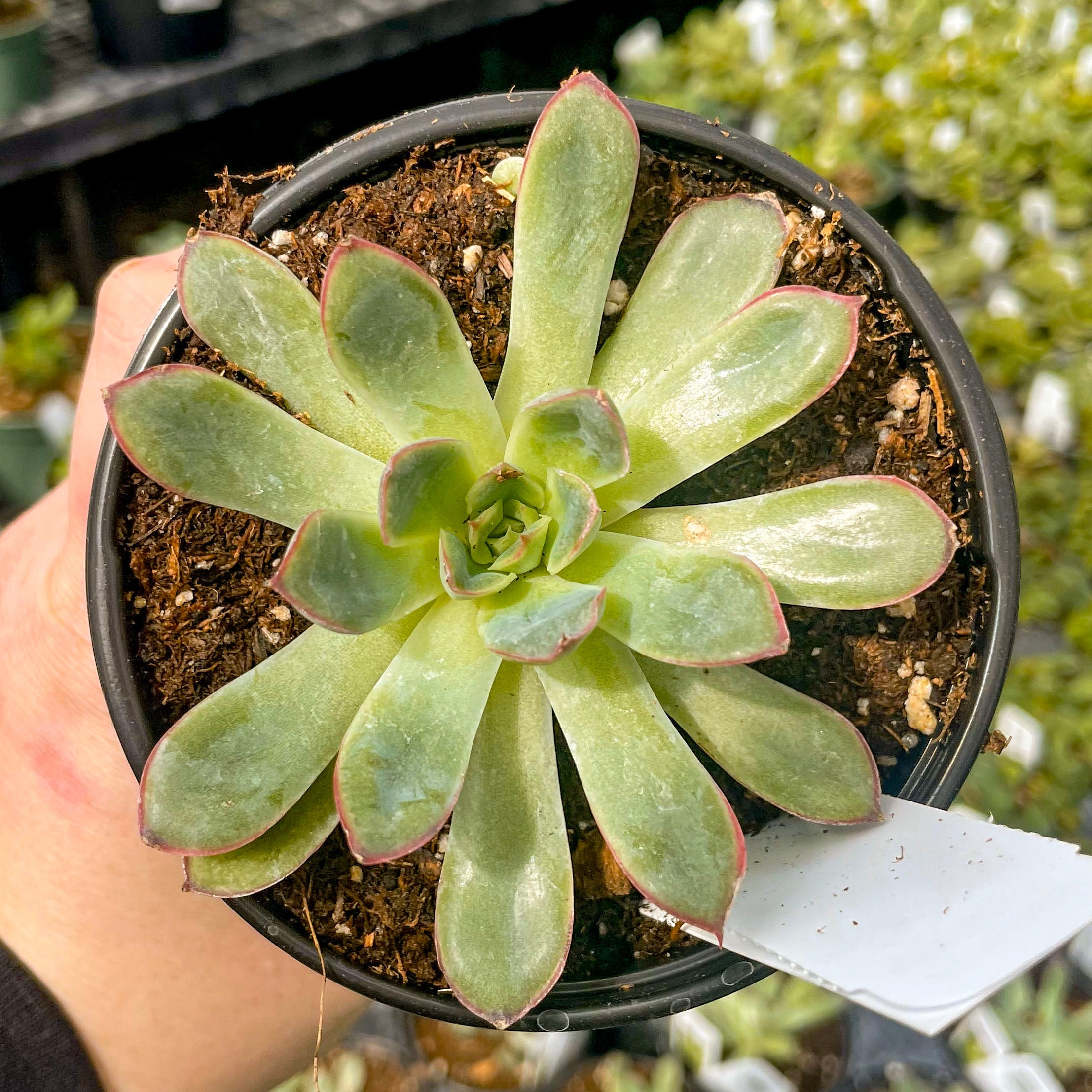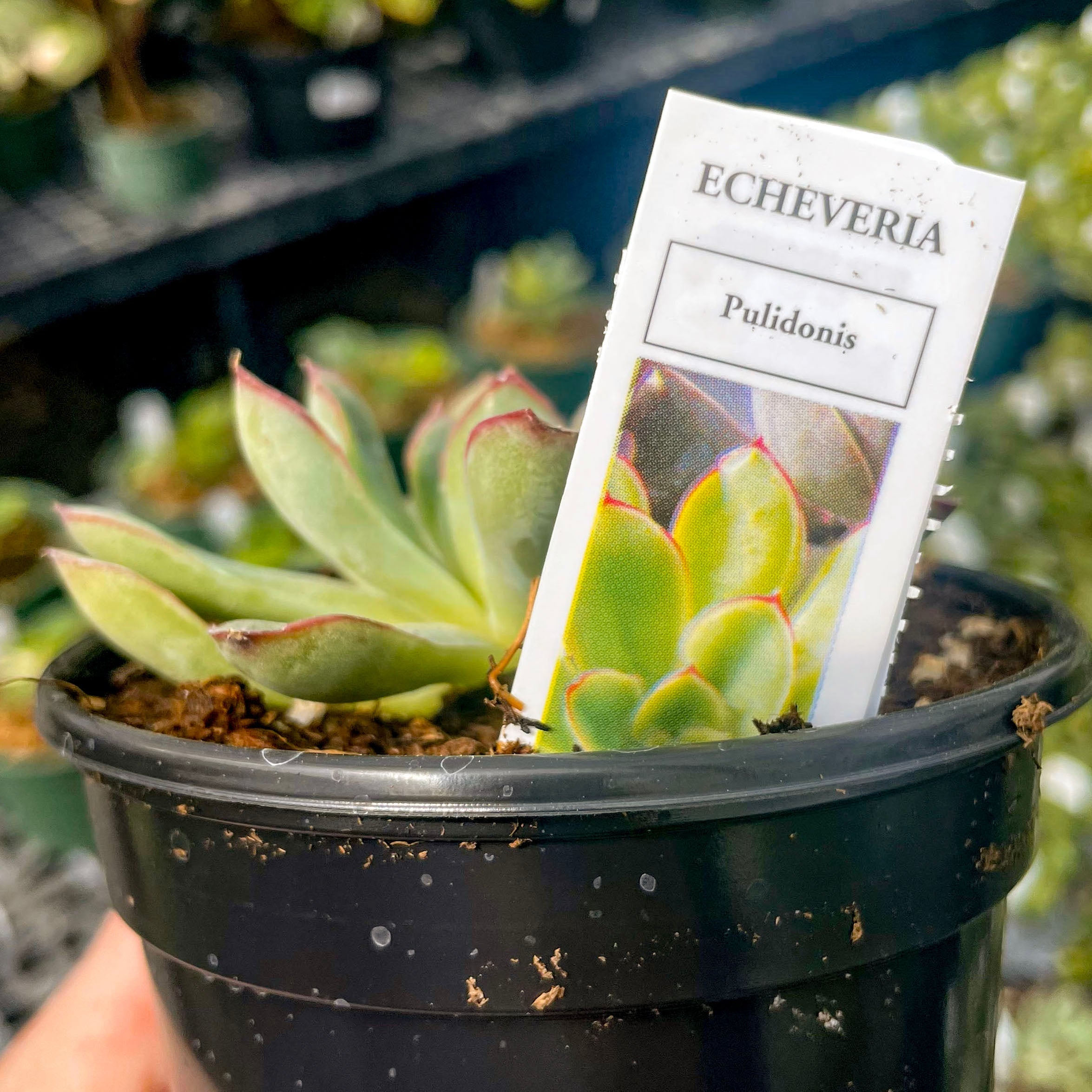Echeveria pulidonis features fleshy, pale blueish-green leaves edged in red, with a distinctive shape—flat to slightly concave on top and rounded beneath, each ending in a striking red tip. This elegant succulent brings a refined charm to rock gardens, container displays, or mixed succulent arrangements.