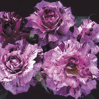 The talent of Jack Christensen really shows through in this extremely novel beauty. Not just every flower, but every petal is a varying masterpiece of amazing purple, lavender & white stripes, streaks, flecks, dots & dashes. Plus there's a powerful perfume of citrus blossom & rose. She's a little fussy to grow as roses go. But each blossom will convince you to keep up the effort. Best flower size & purple color in cooler conditions.