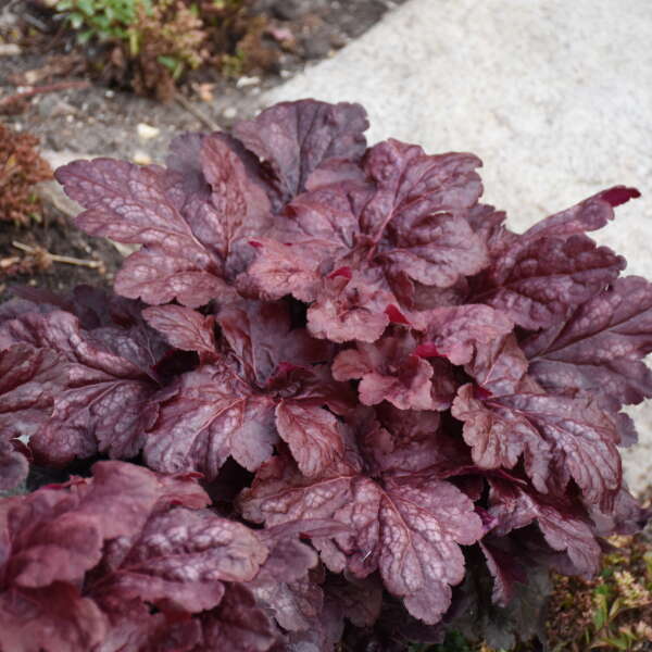 An impressive red Heuchera consisting of massive heavily textured leaves. 5-7" wide burgundy red leaves have a coppery finish with newly expanding leaves showing a silvery overlay. White flowers on tall scapes.