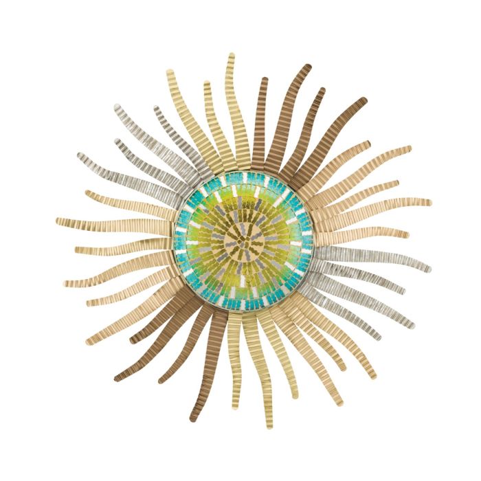 Wavy tri-colored Sun rays in soft metallic tones compliment the gold and aquamarine hand-placed mosaic glass center in this impressive wall decor.