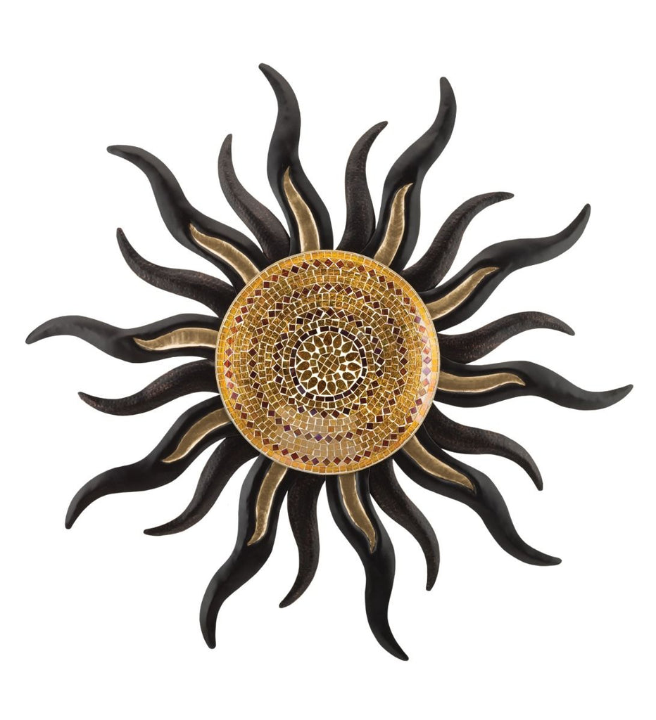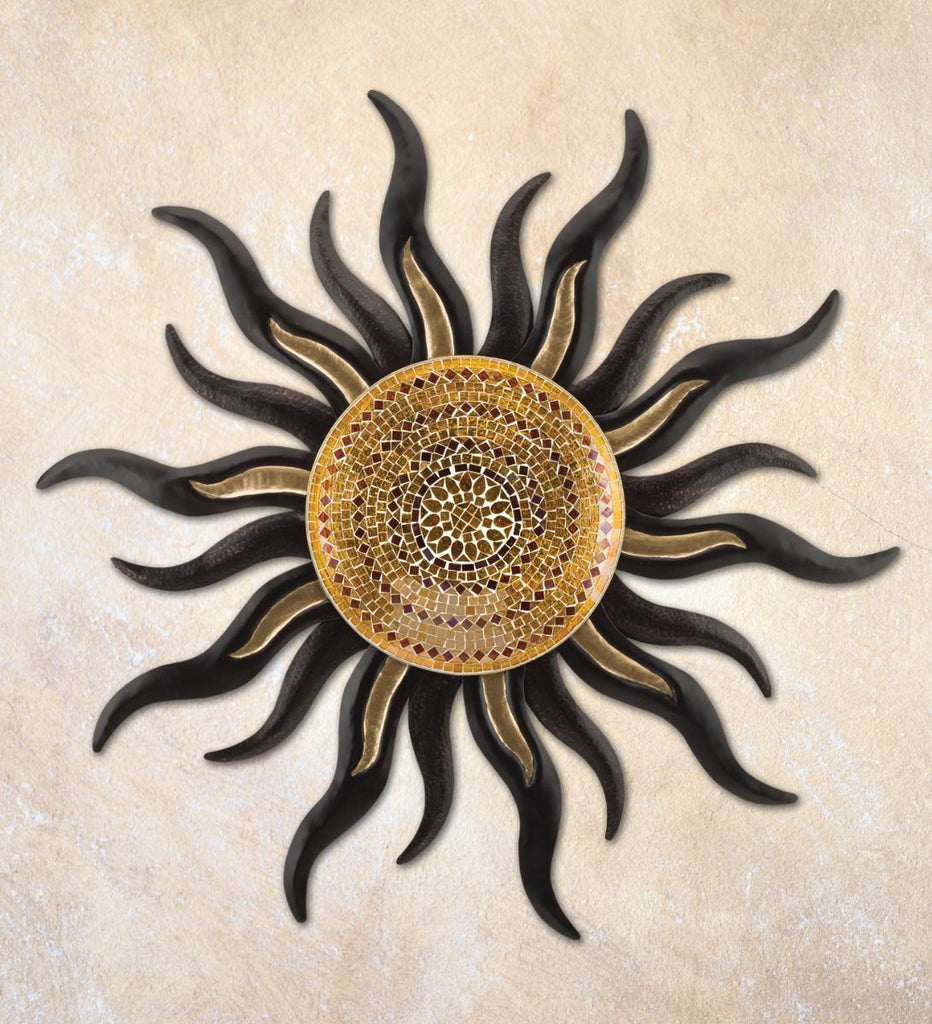 Contrasting black and golden colored rays surround the center of this impressive Sun Wall Décor, giving an opulent contemporary feel. The center disk is made from gold and earth toned mosaic glass pieces, all hand placed forming a beautiful design.