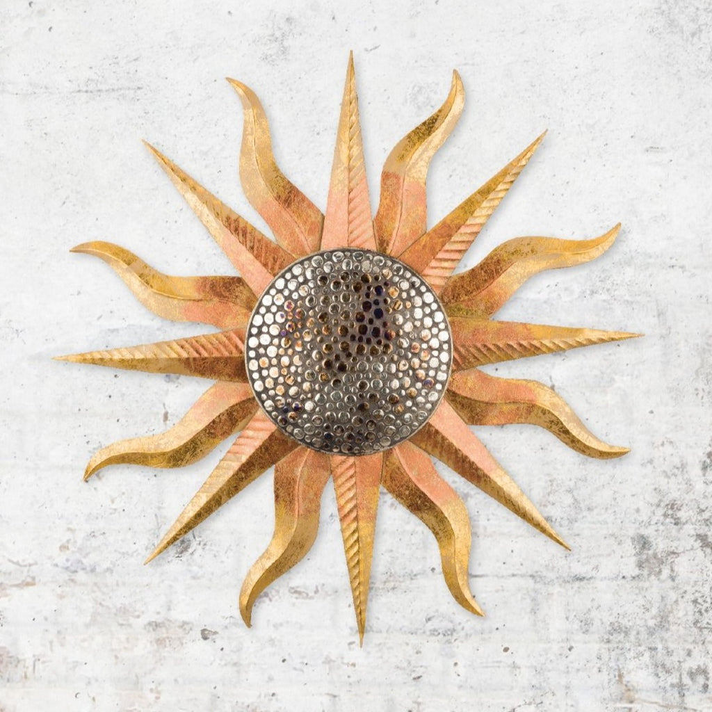 Metal flat beads that mimic mosaic glass are hand placed in the center dome of this marvelous 24" Sun Wall Decor. The sun rays are painted in gold and copper accents for a nice contrast.