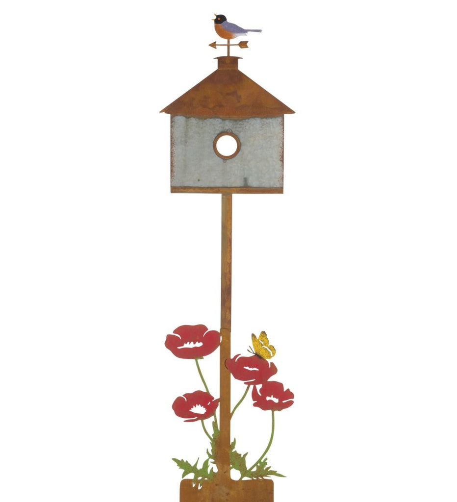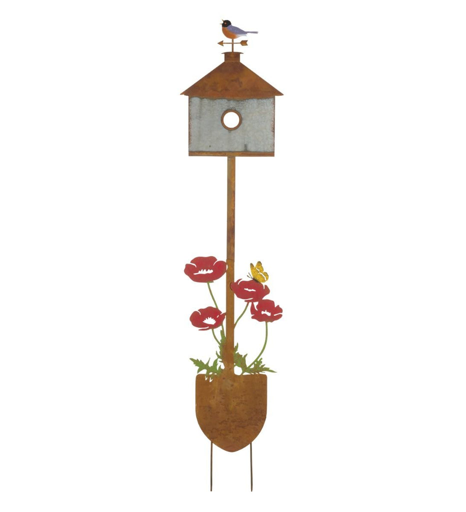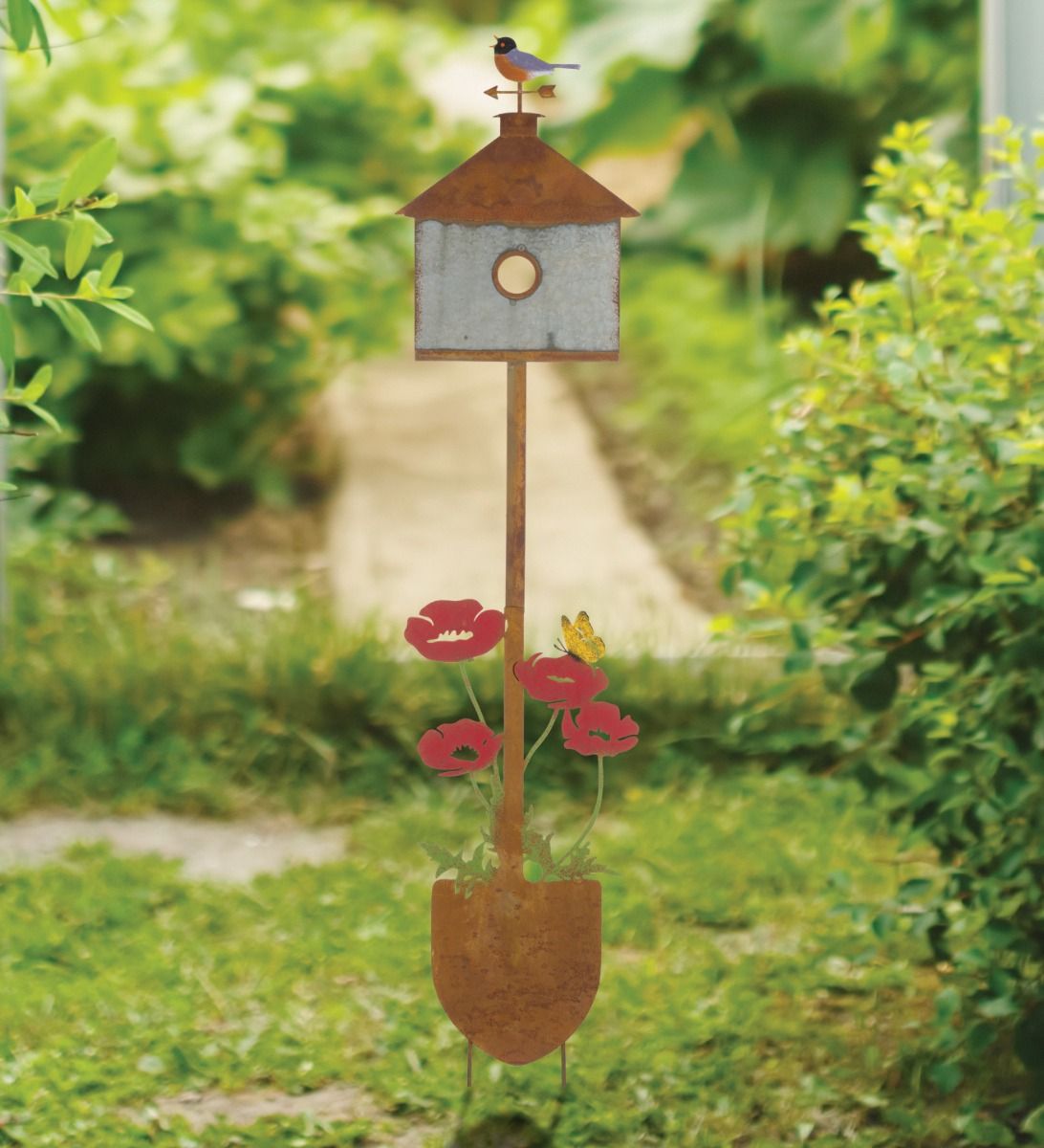 Country style faux birdhouse stakes and shovels made with galvanized or painted metal and colorful flowers.