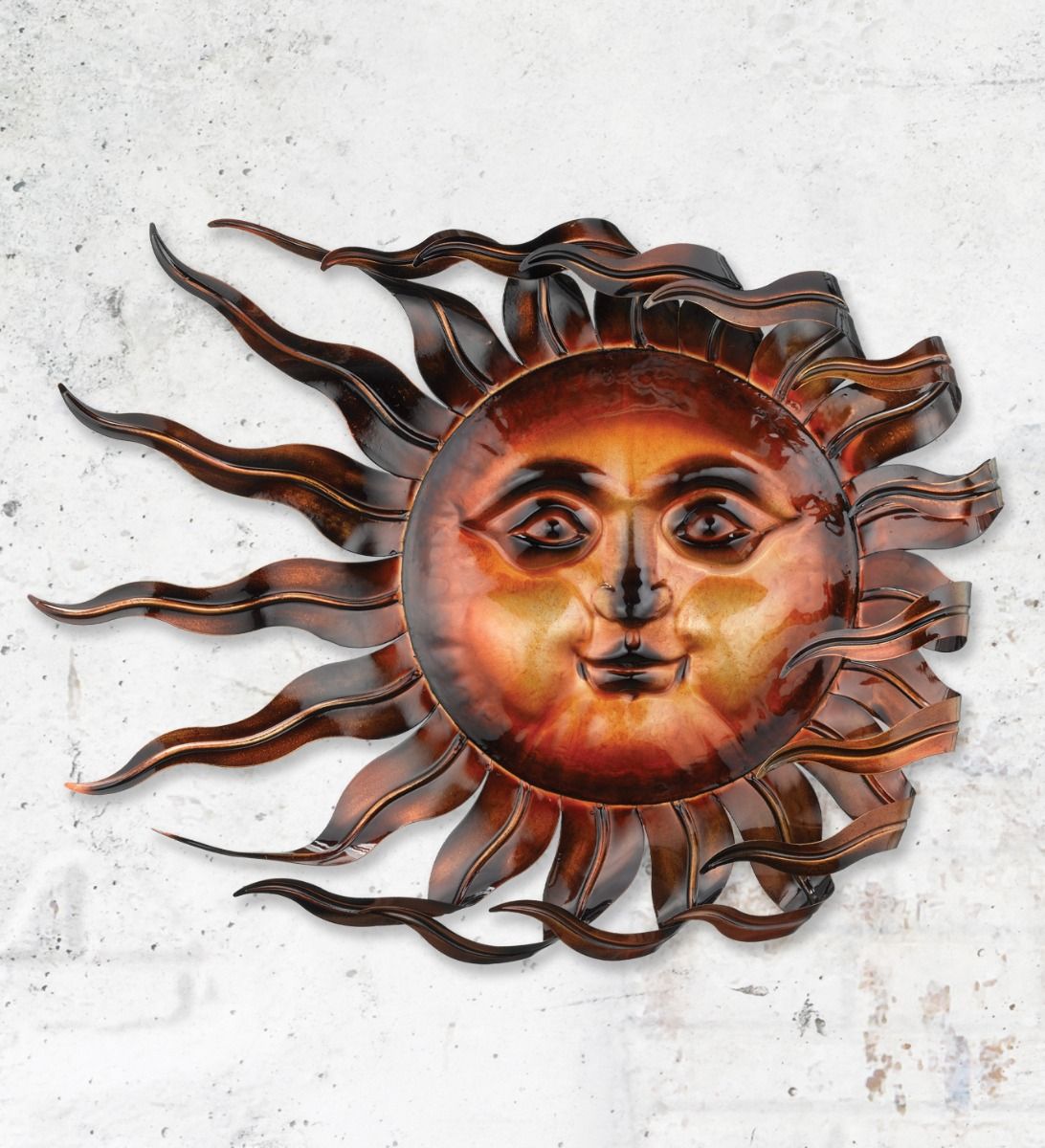The sun is always shining with this Windswept Sun 26" wall decor. The 3-dimensional metal art piece has a friendly face and is hand-painted in fiery tones.