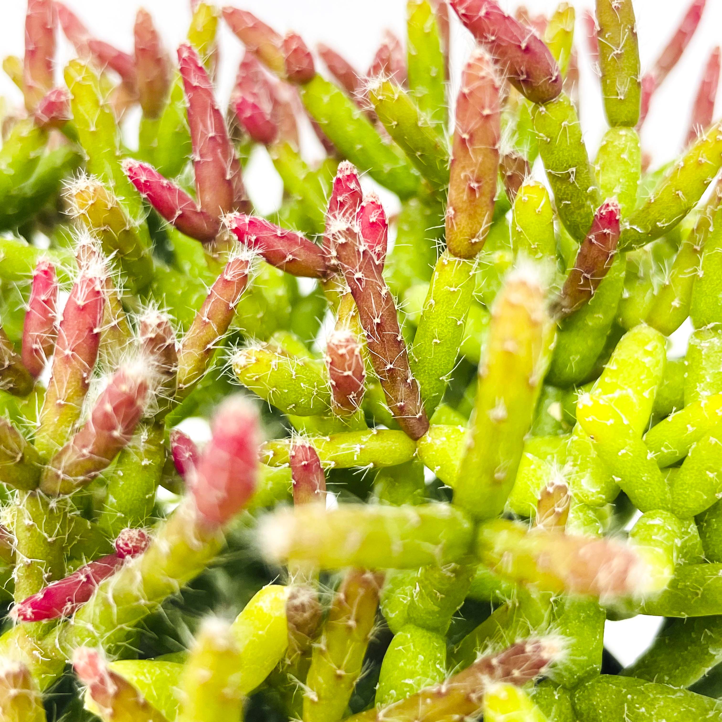 Mistletoe Cactus is a thornless cactus that forms an elegant cascade of tiny branches. Creamy-white flowers adorn the branches, eventually making way to for pink fruits.