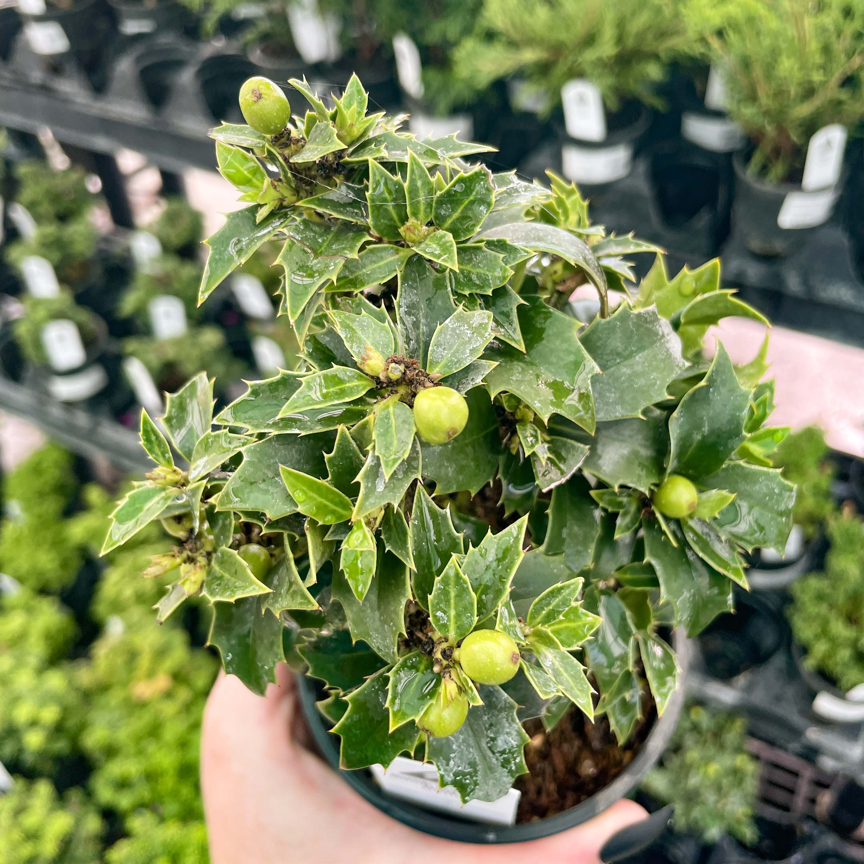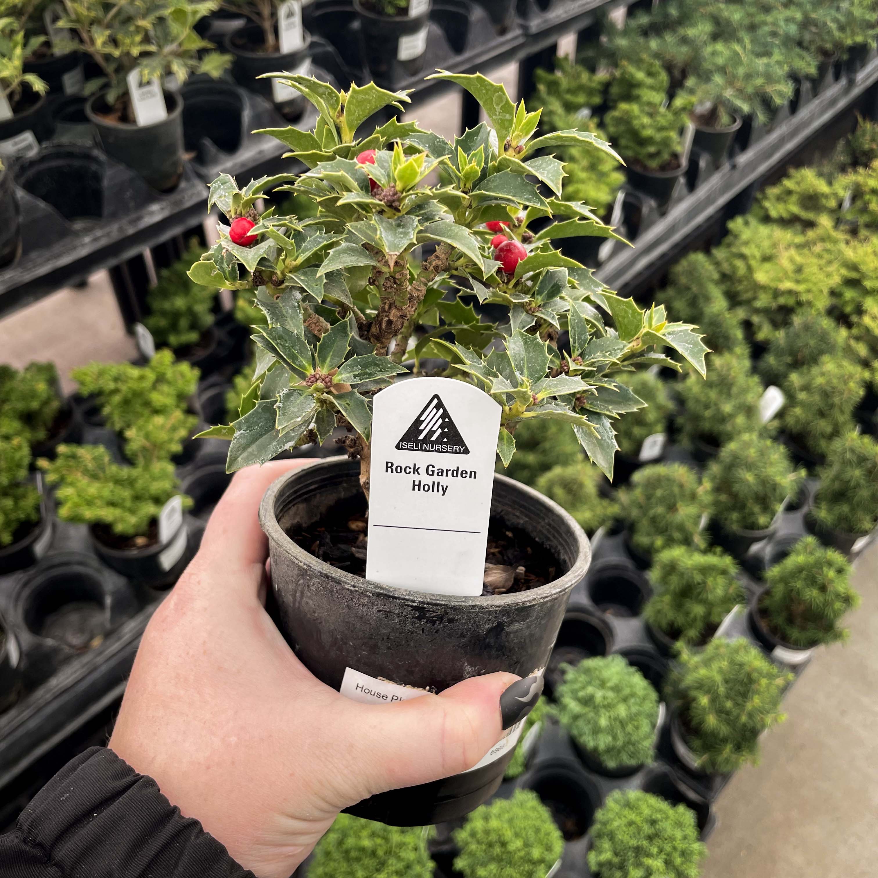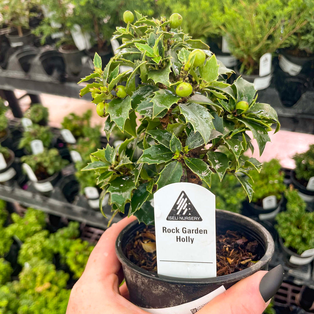 Ilex x ‘Rock Garden’ is a diminutive female holly that stands out for its glossy, deep green foliage and dense, globose growth habit. Maturing to less than 1 foot in height, this compact variety is perfect for troughs, rock gardens, small landscapes, or even as a bonsai specimen. Despite its small stature, ‘Rock Garden’ adds year-round interest with minimal maintenance, making it a charming solution for tight garden spaces or containers.
