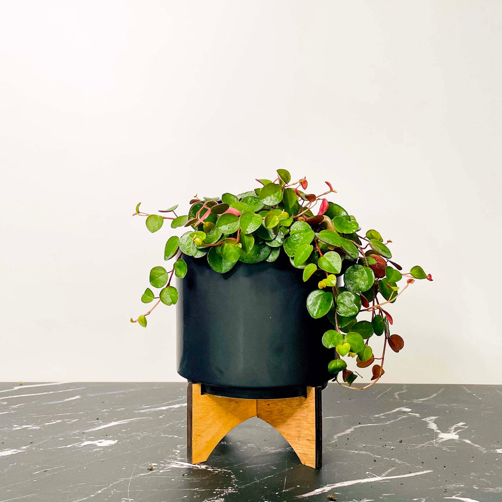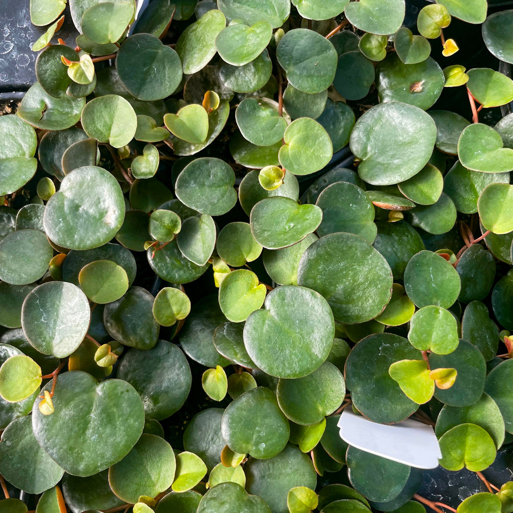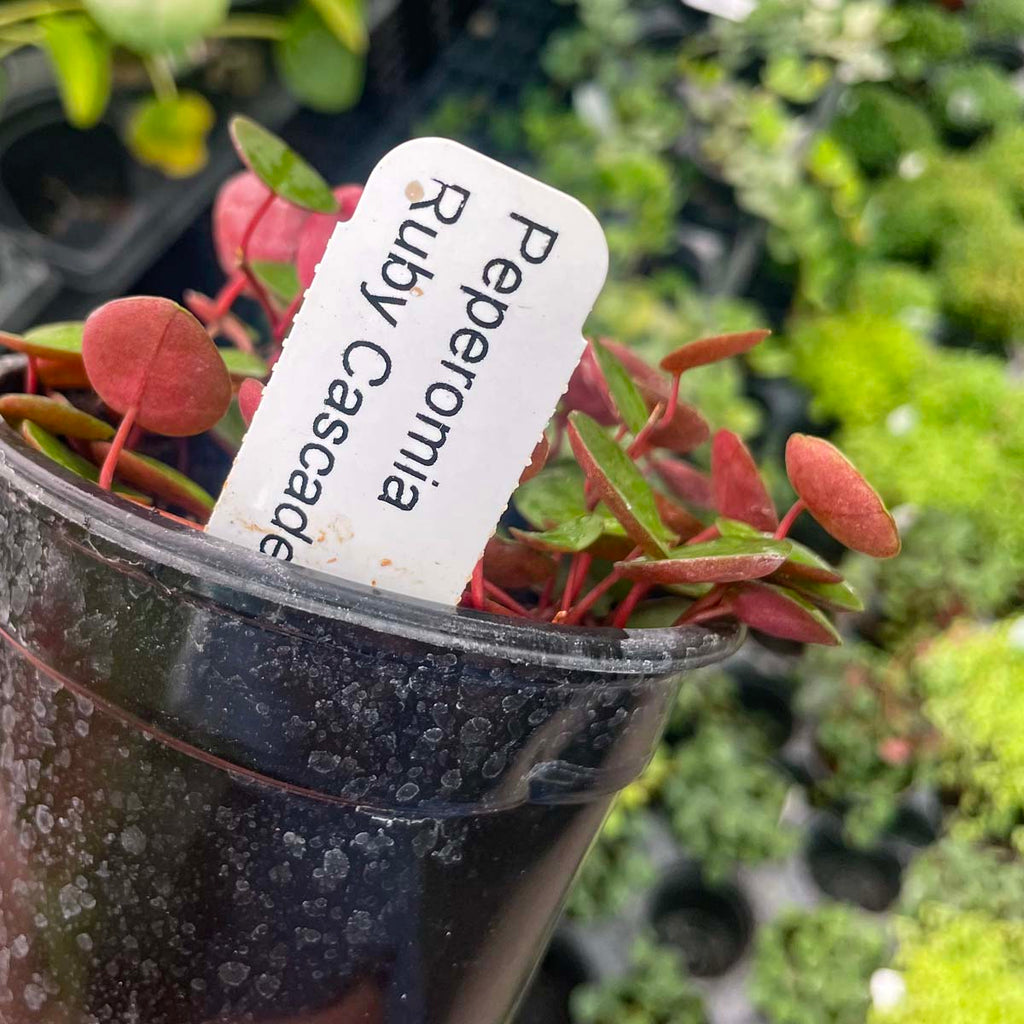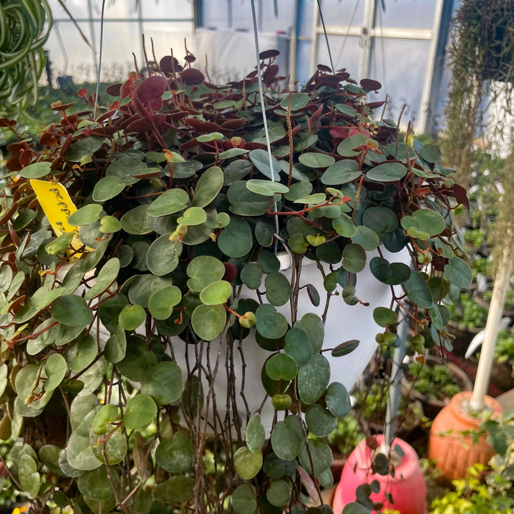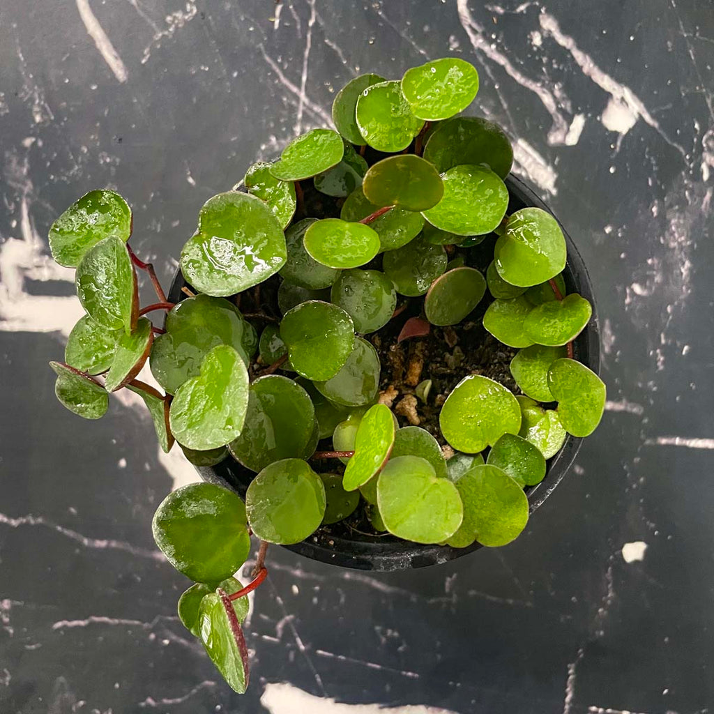 Peperomia rotundifolia 'Ruby Cascade' is a striking semi-succulent vining plant known for its dark, glossy leaves and cascading habit. Thriving best in bright, direct light, this plant truly shines when placed in front of a sunny window, as it does not perform well in lower light conditions.