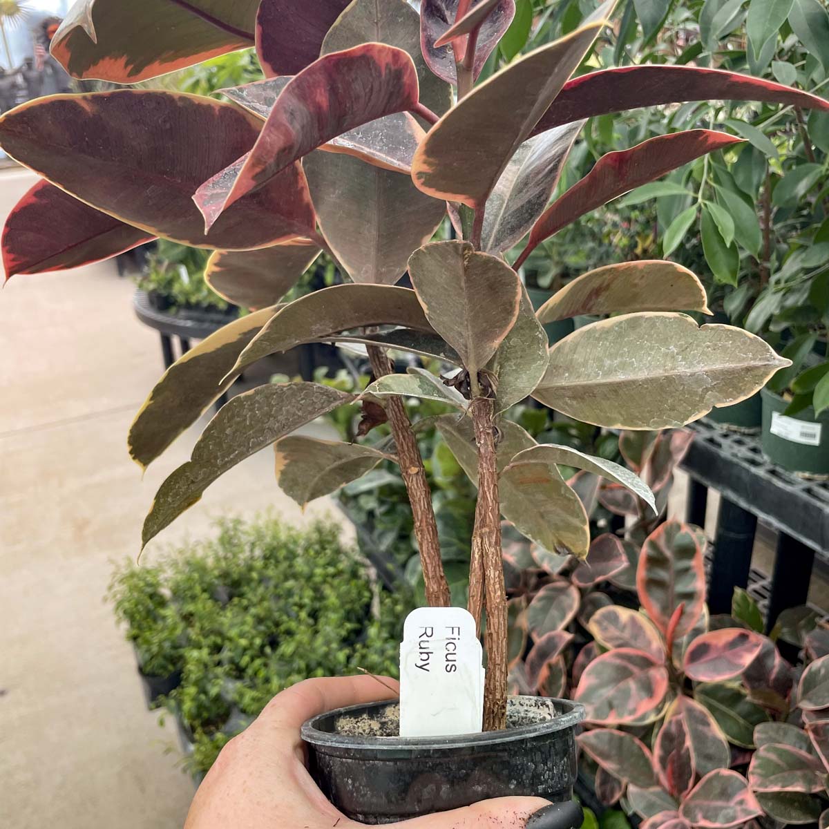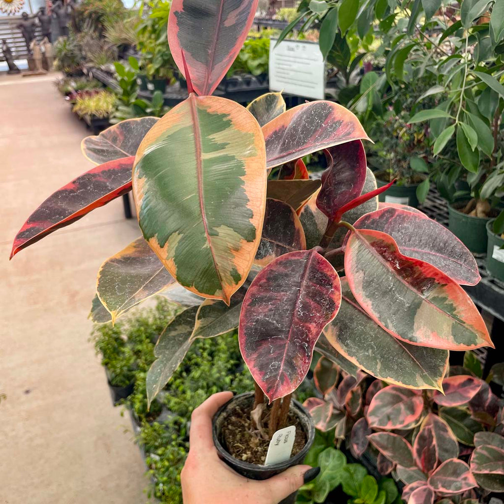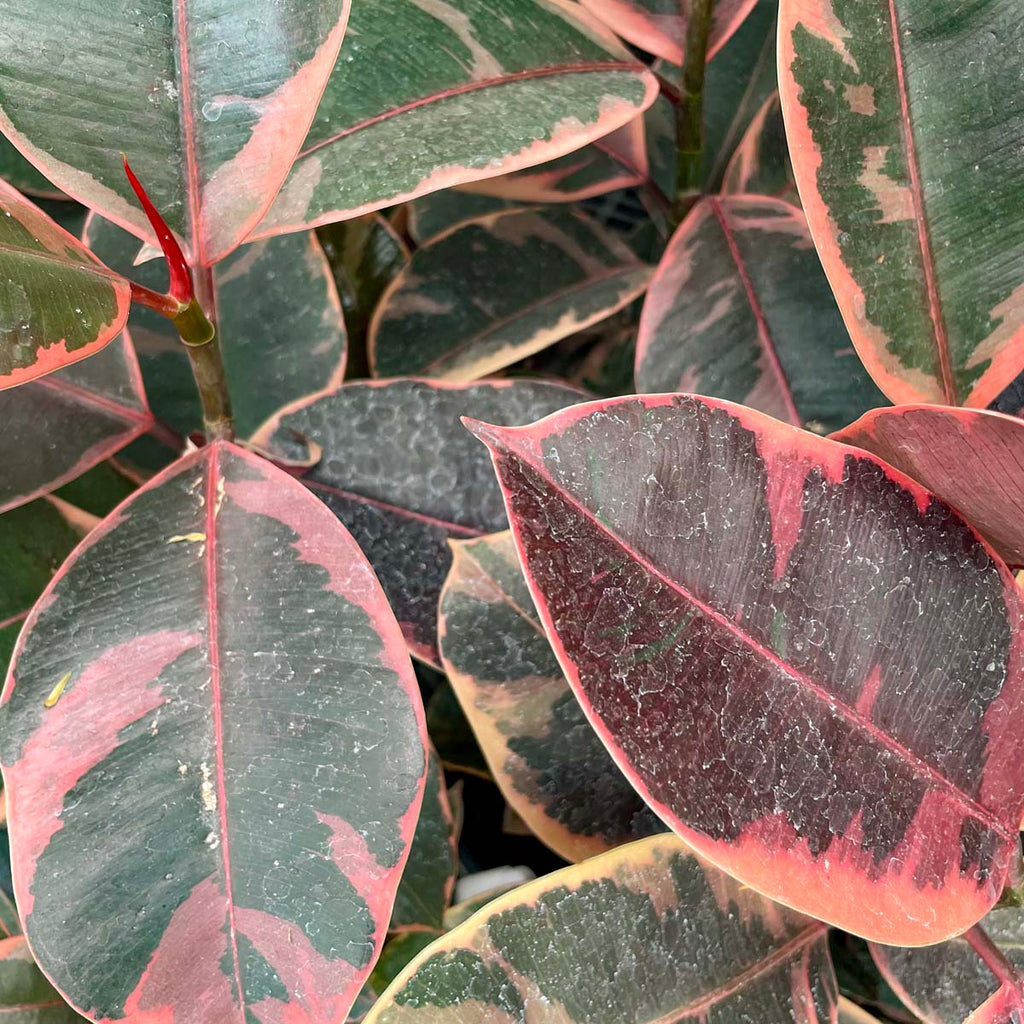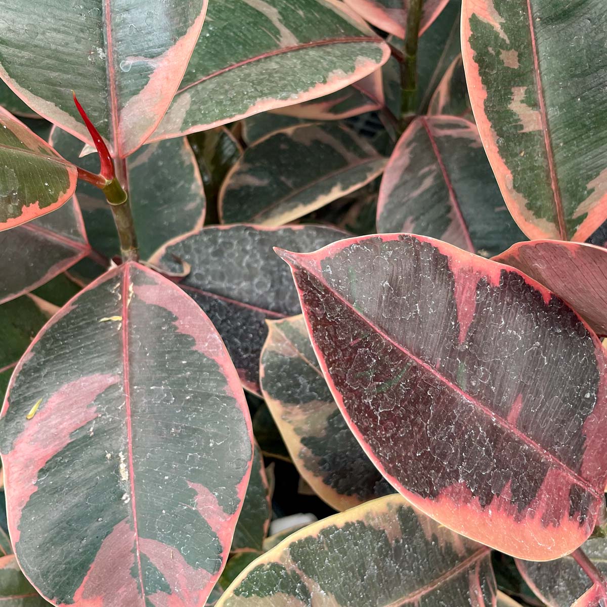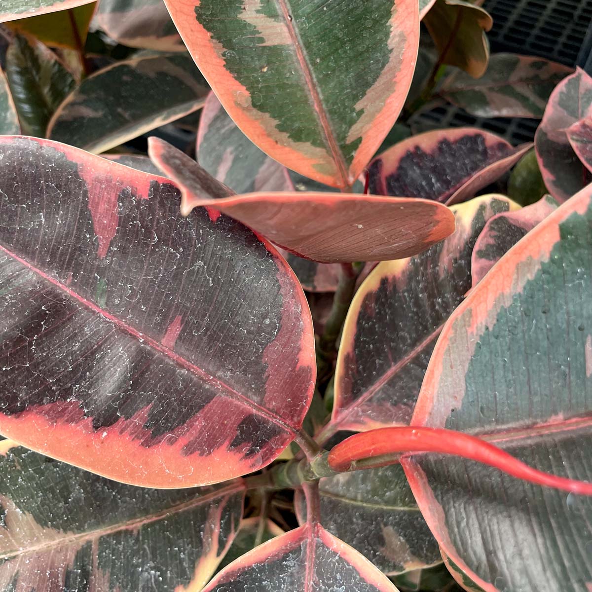 Ficus elastica 'Ruby,' commonly known as the Ruby Rubber Tree, showcases stunning tricolor variegation on its large, thick, rubbery leaves. Its foliage features a mesmerizing pink, red, purple, cream, and bronzed green patchwork, making it a standout houseplant with a bold and tropical vibe.