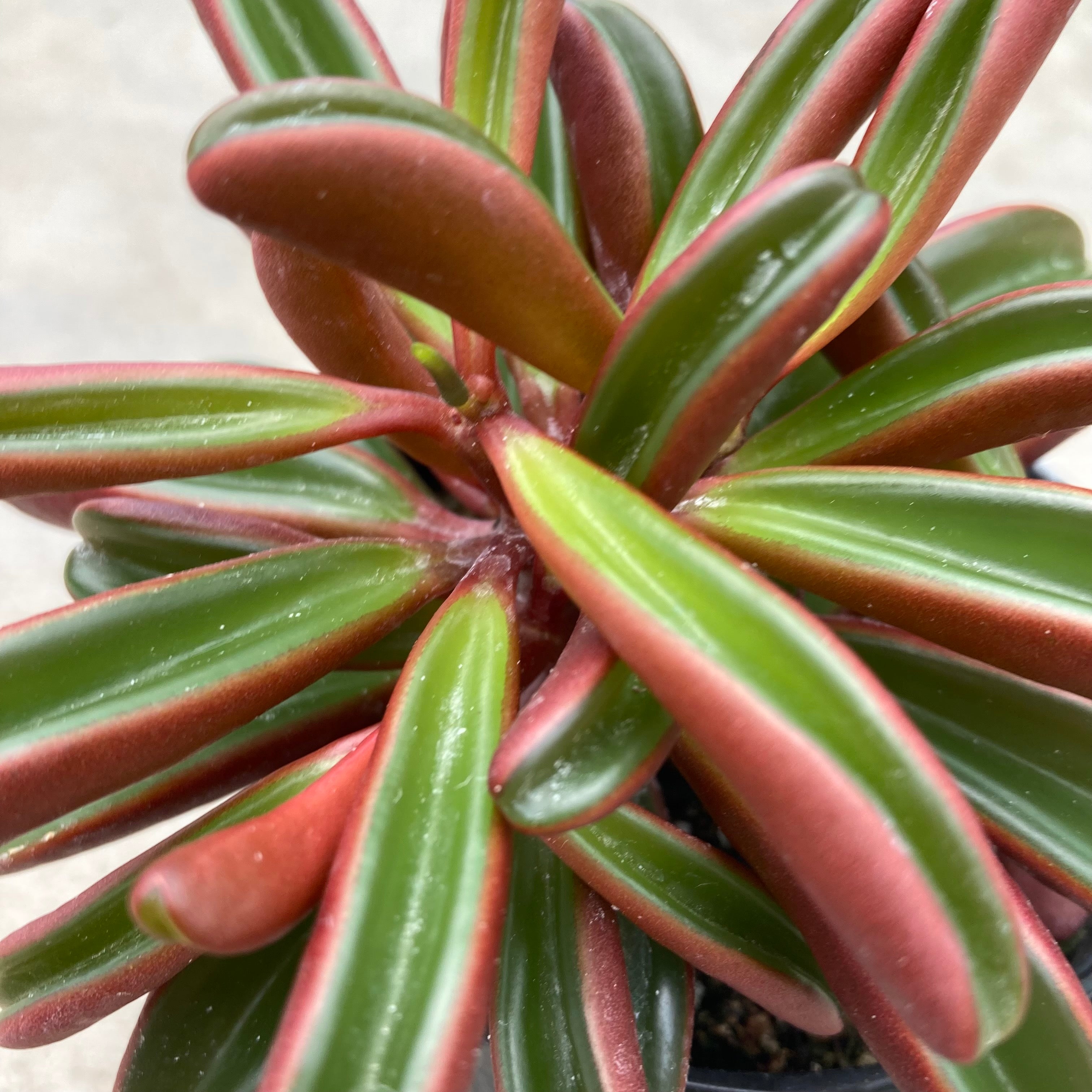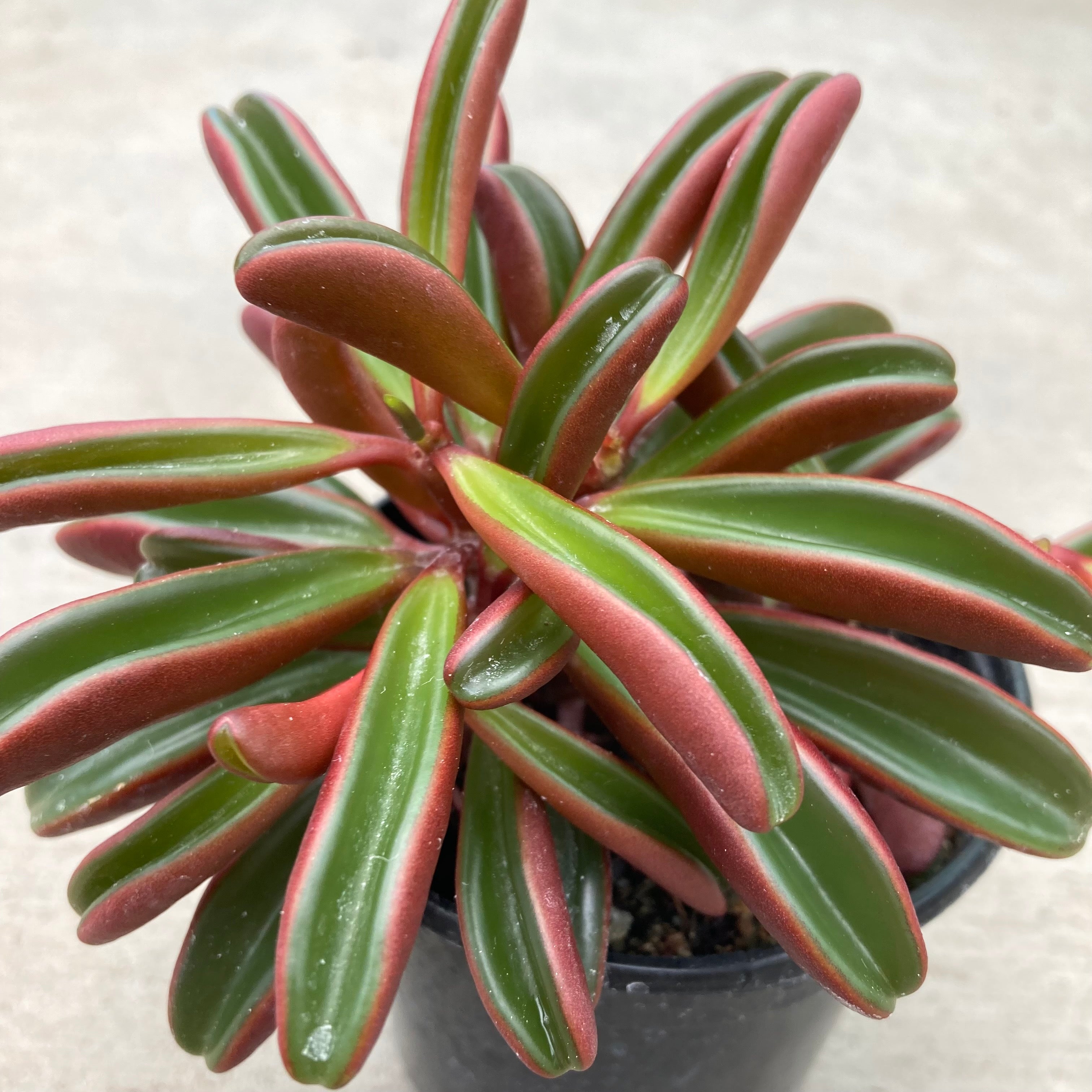 Ruby Glow features red wine colored stems with succulent leaves that are red wine colored on the bottom and green up top.