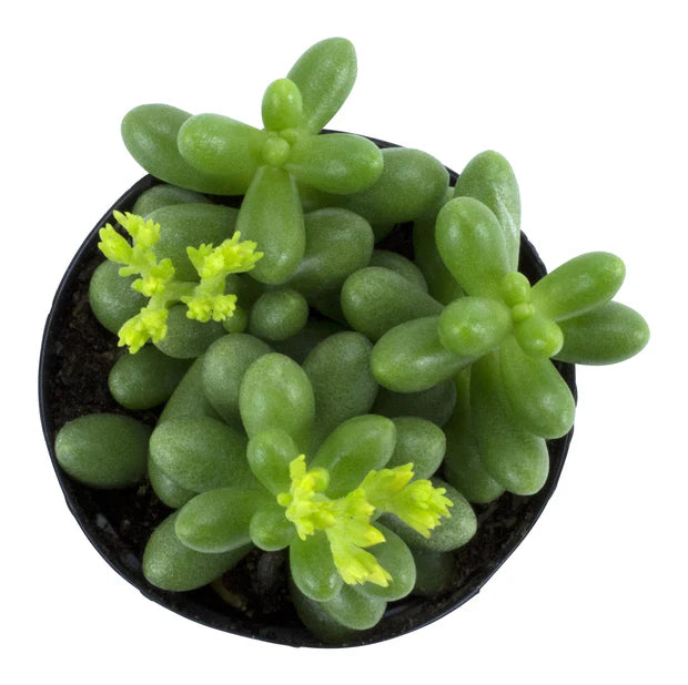 Large star-shaped yellow flowers appear in winter and spring. Sedum hernandezii is one of the "jellybean" sedums, so named for their exceedingly plump and colorful jellybean shaped leaves. A very low grower, this sedum does well as a potted specimen, great for dish gardens, windowsills, and wreaths.