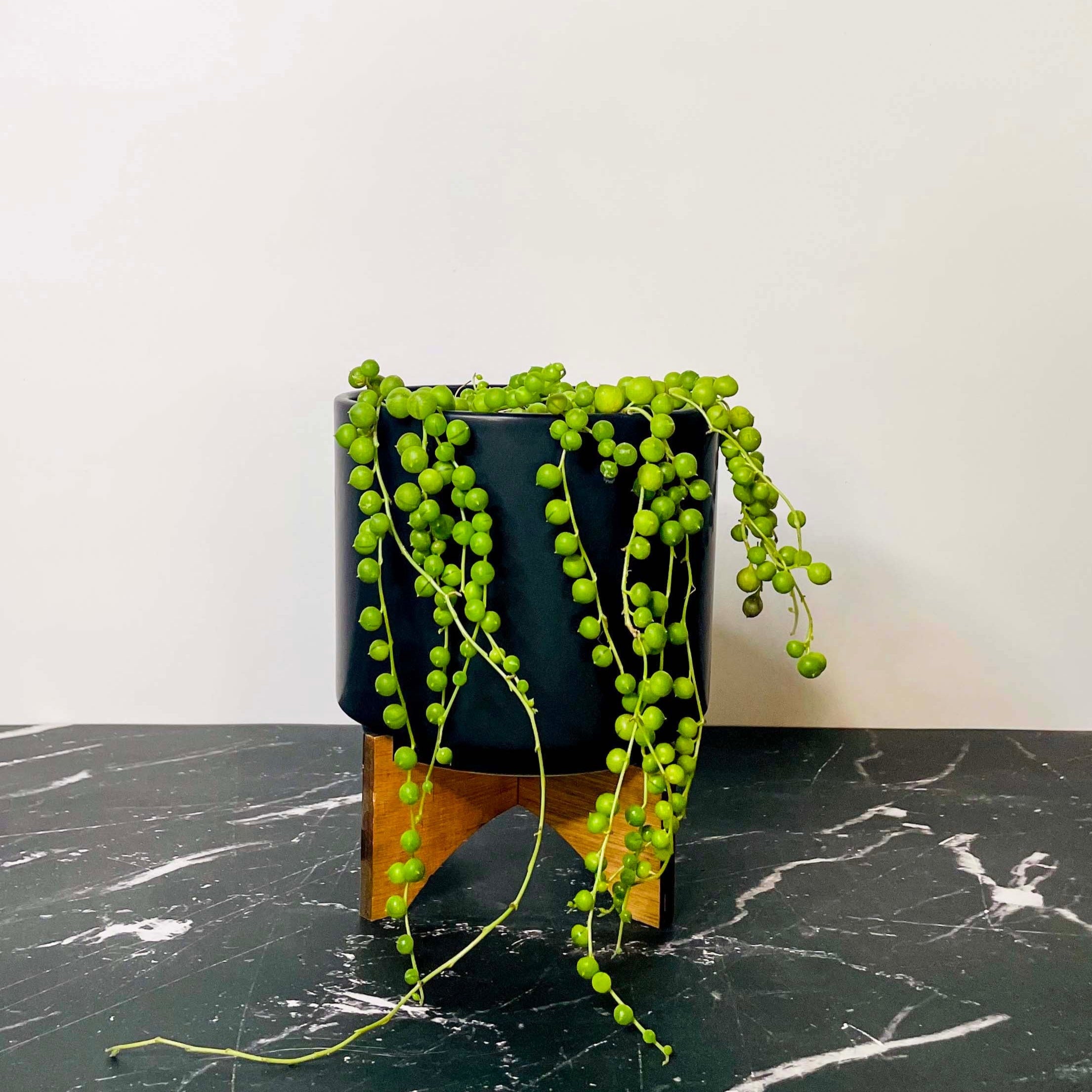 String of Pearls, also known as String of Beads and Rosary Beads, is an eye-catching succulent celebrated for its distinctive, bead-like foliage. Tiny, spherical green leaves cascade along slender, trailing stems, creating a striking display that is perfect for hanging baskets, rock gardens, or any space where a unique accent is desired.