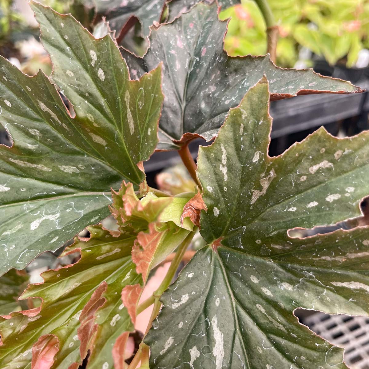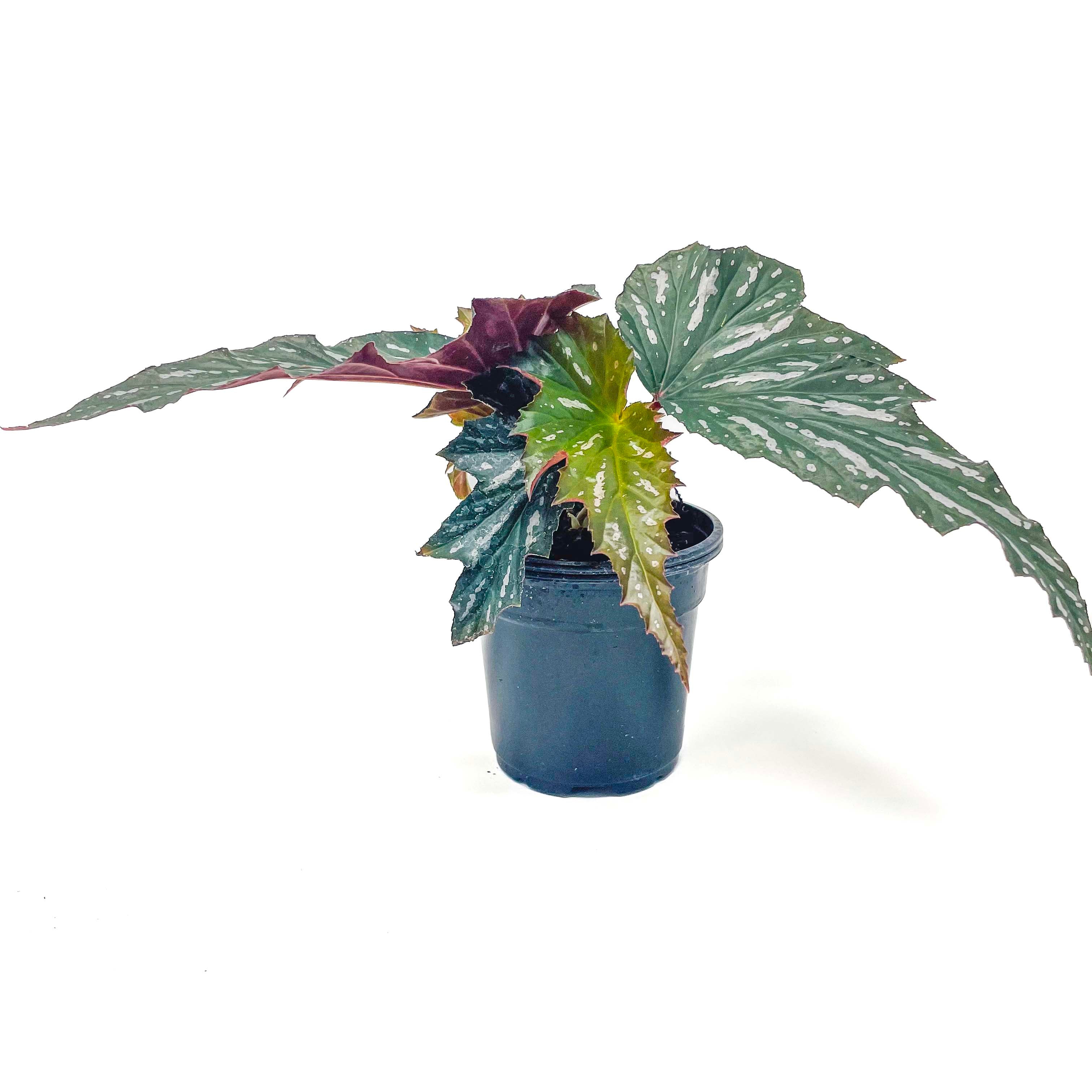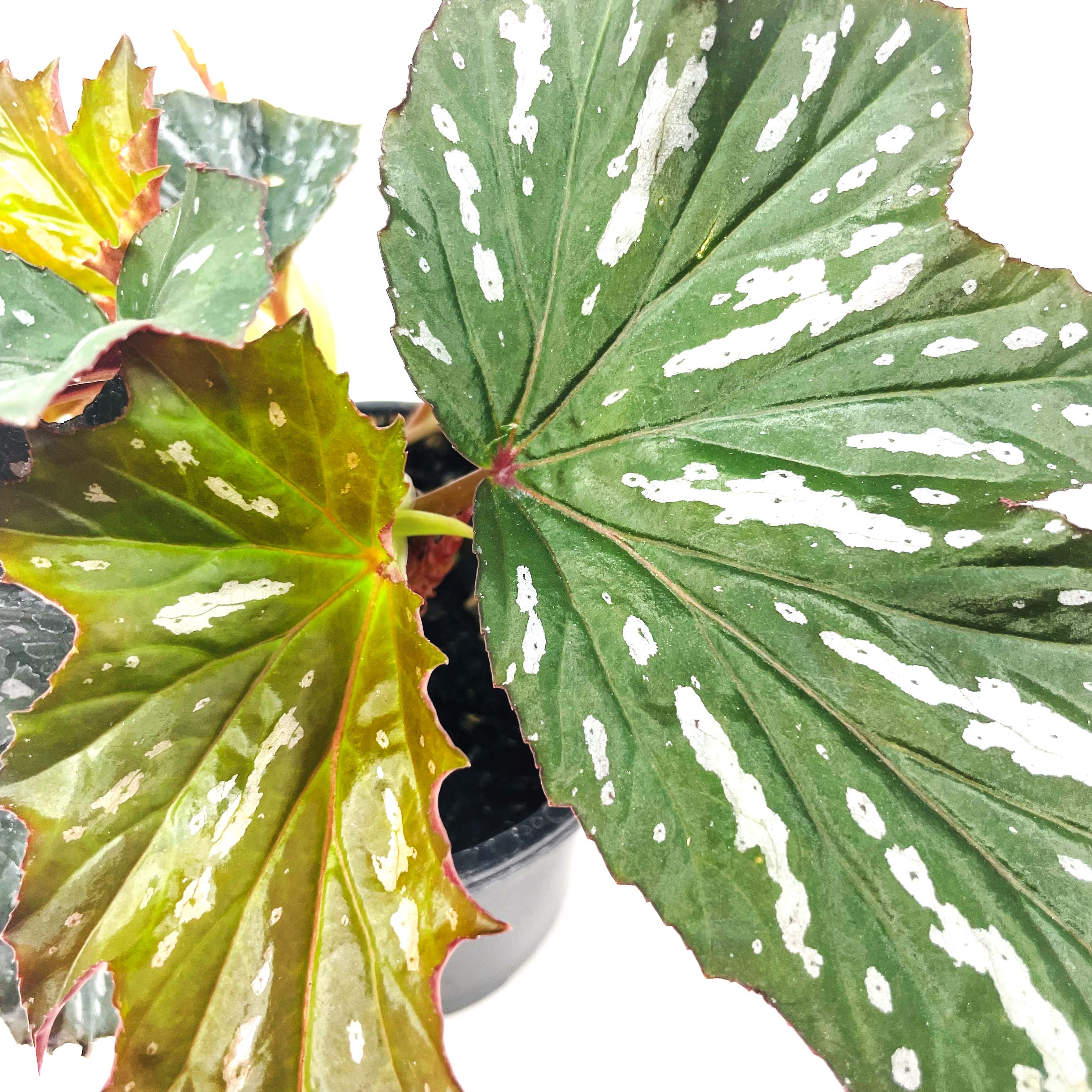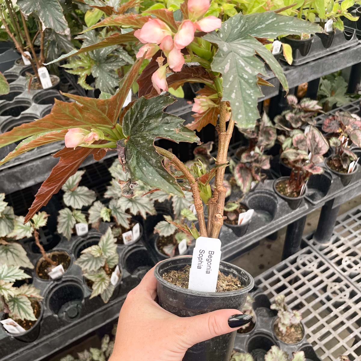 Thriving in bright, indirect light, Begonia 'Sophia' requires well-draining soil and prefers to be watered when the top inch of soil feels dry. It’s not only a visual treat but also blooms with delicate pink flowers, adding a touch of soft color to its dramatic leaf display. 'Sophia' is perfect for those looking to add a sophisticated flair to their home or office space.