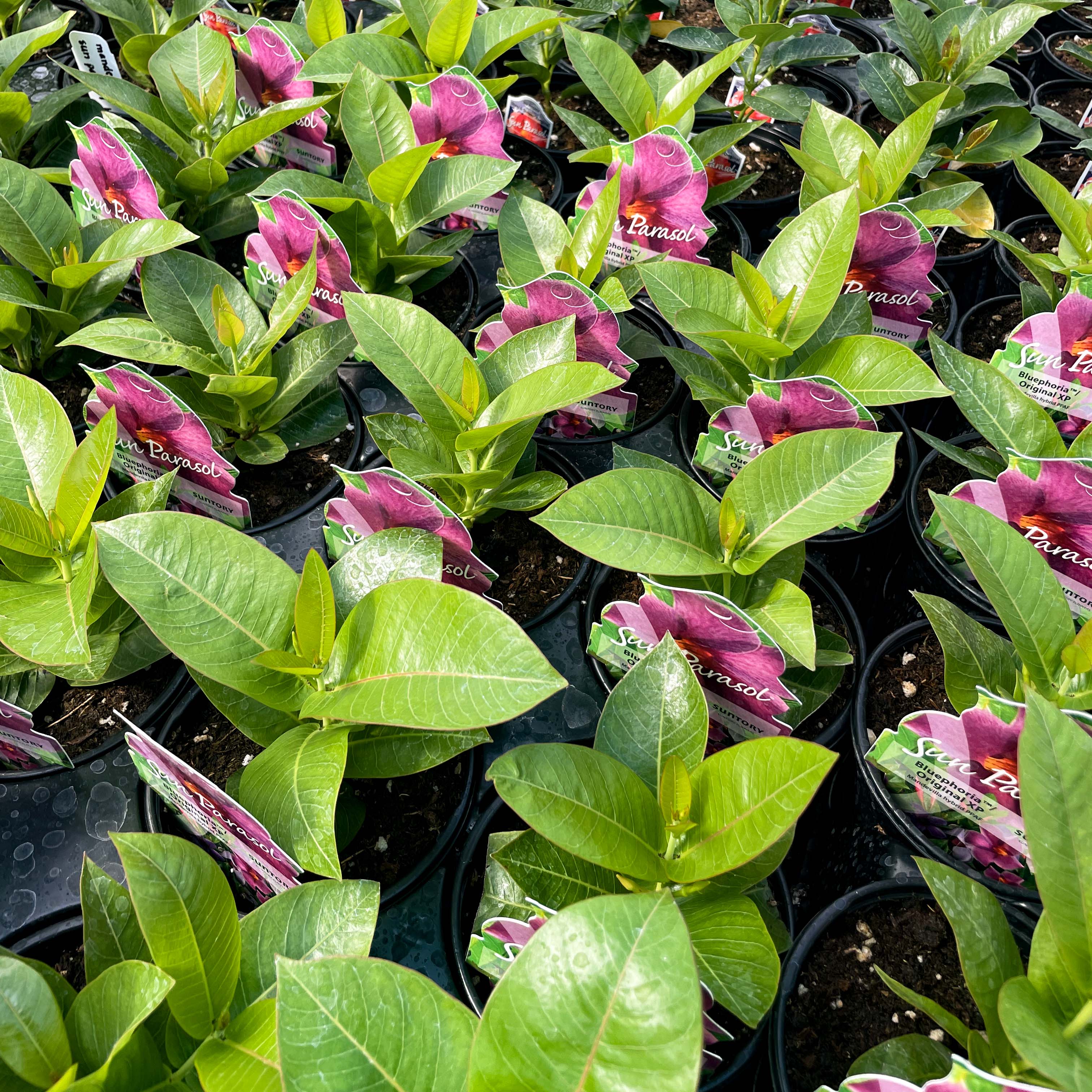 Ideal for a variety of settings, from garden beds to containers and hanging baskets, this Mandevilla excels in full sun and requires well-draining soil to thrive. Its robust growth and striking floral display make it an excellent choice for adding continuous color and tropical flair throughout the growing season. Whether used as a standalone plant or mixed with other sun-loving varieties, ‘Sun Parasol Original XP Bluephoria’ ensures a stunning visual impact.