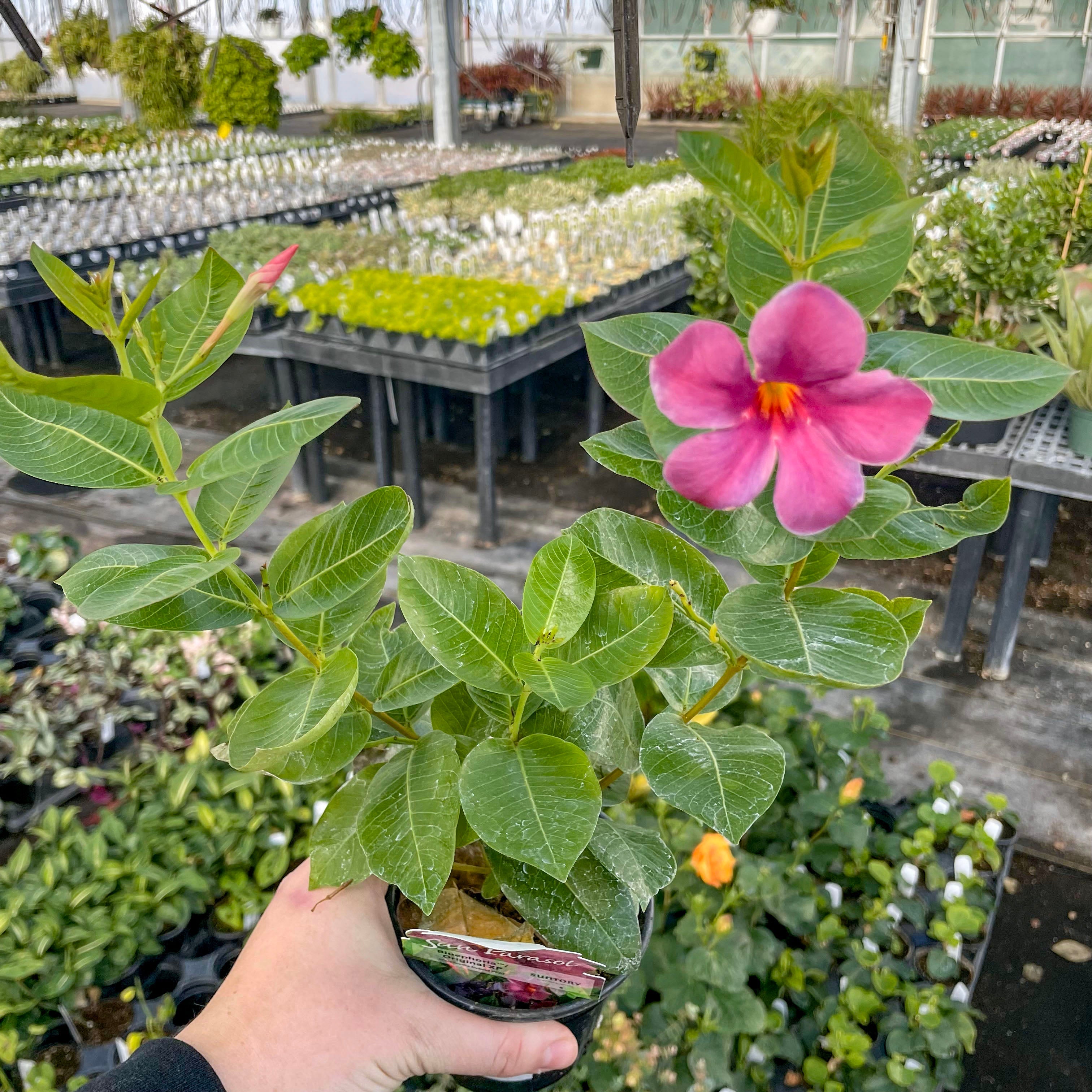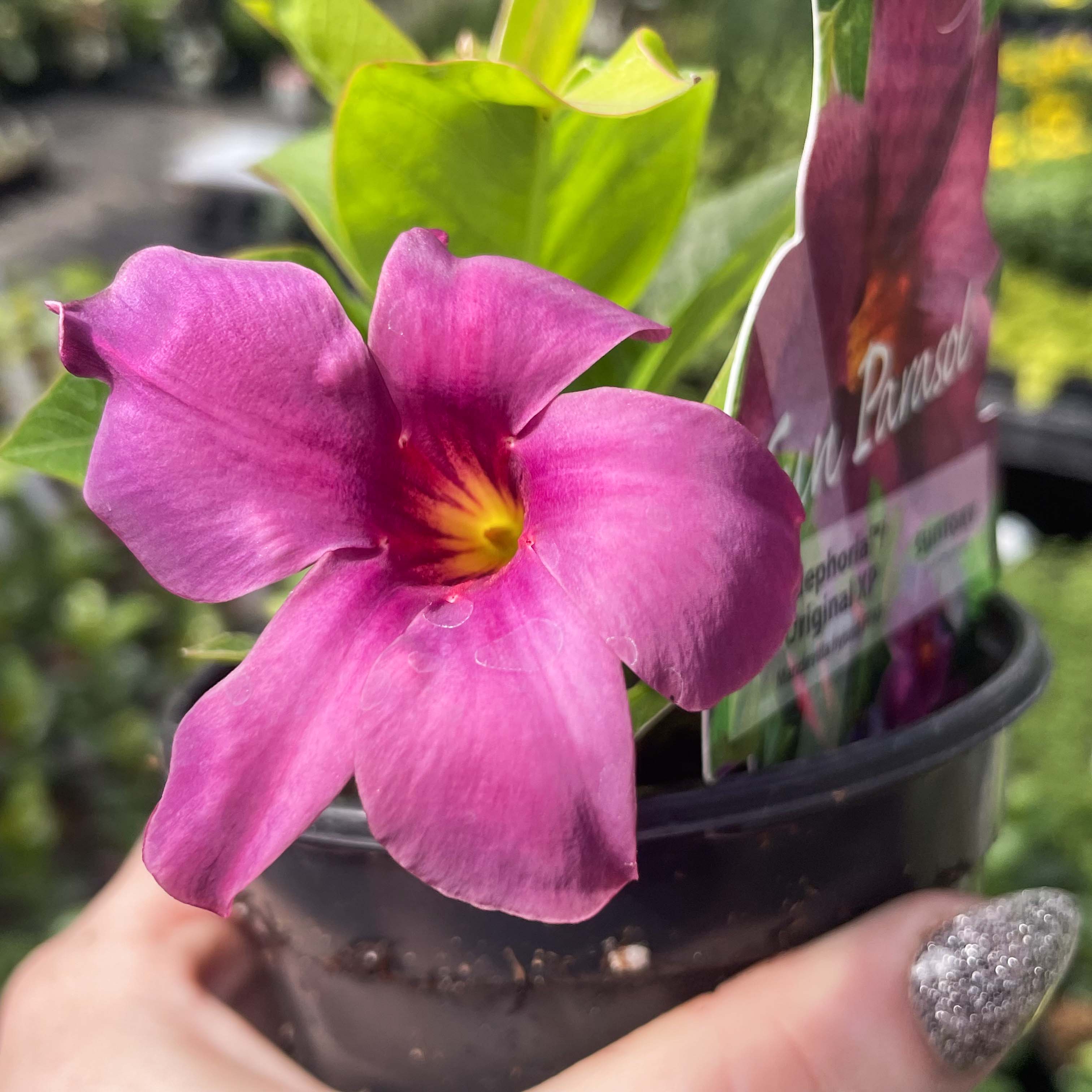Experience the vibrant and novel appeal of Mandevilla ‘Sun Parasol Original XP Bluephoria’, renowned for its superior branching and prolific flowering capabilities. This standout variety captivates with its unique blue flowers that emerge from enchanting pink buds, adding a rare and intriguing hue to the Sun Parasol series. Known for its early blooming, 'Bluephoria' is a dynamic addition to any garden.