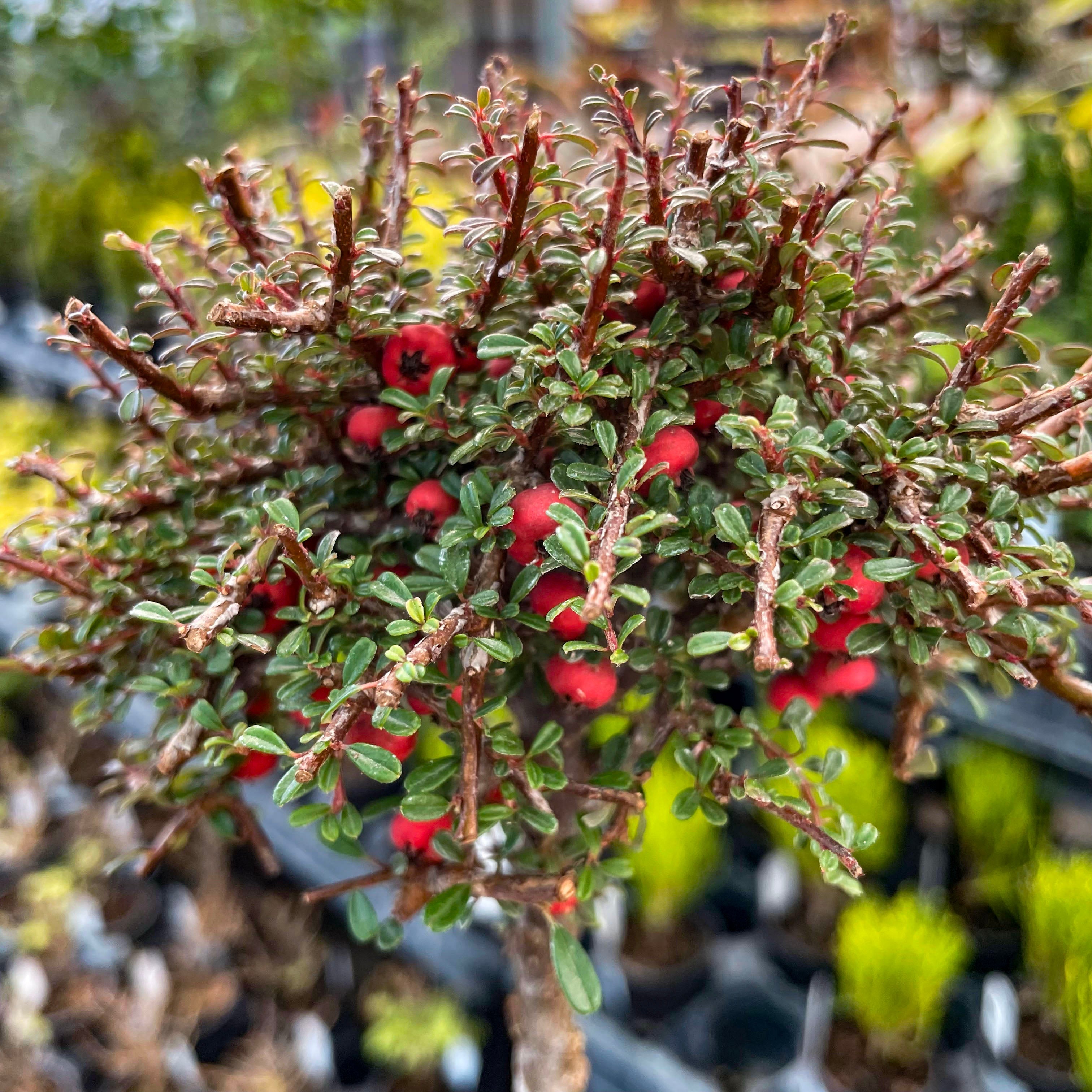 Thyme Leaf Cotoneaster is a charming evergreen featuring tiny, glossy green leaves and bright red berries on gracefully arching branches. Its fine texture and compact habit make it a perfect addition to miniature-themed gardens, where its small-scale foliage and berries create a natural, woodland-like aesthetic.