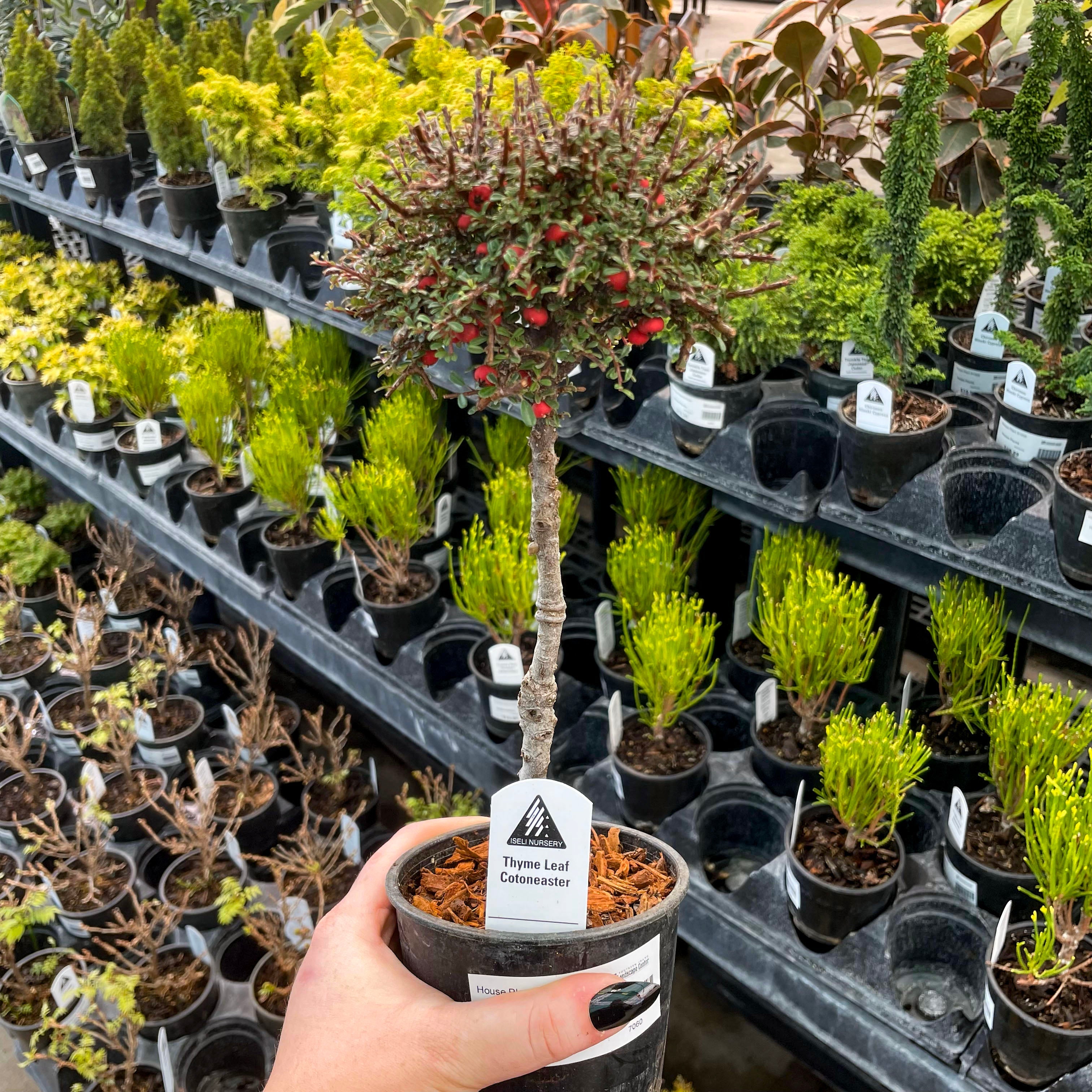 This versatile plant is equally well-suited for rock gardens, borders, and containers, offering year-round interest. When grafted onto a 12” standard, its branches can be trained upright to resemble tiny trees, adding a unique and sculptural element to small garden spaces. Low-maintenance and visually striking, Thyme Leaf Cotoneaster is an excellent choice for creative and space-conscious gardeners.