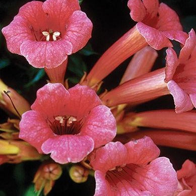 Shrubby, coarse foliage on a vigorous, twining vine. Will climb on stone or woodwork. Flowers are showy, orange and scarlet, 2.5-3" long, 1.5" wide at mouth, blooming in mid-summer. For protected locations in zone 4. Cut back to 8" to insure better bud break at time of planting. Yellow-green fall foliage.