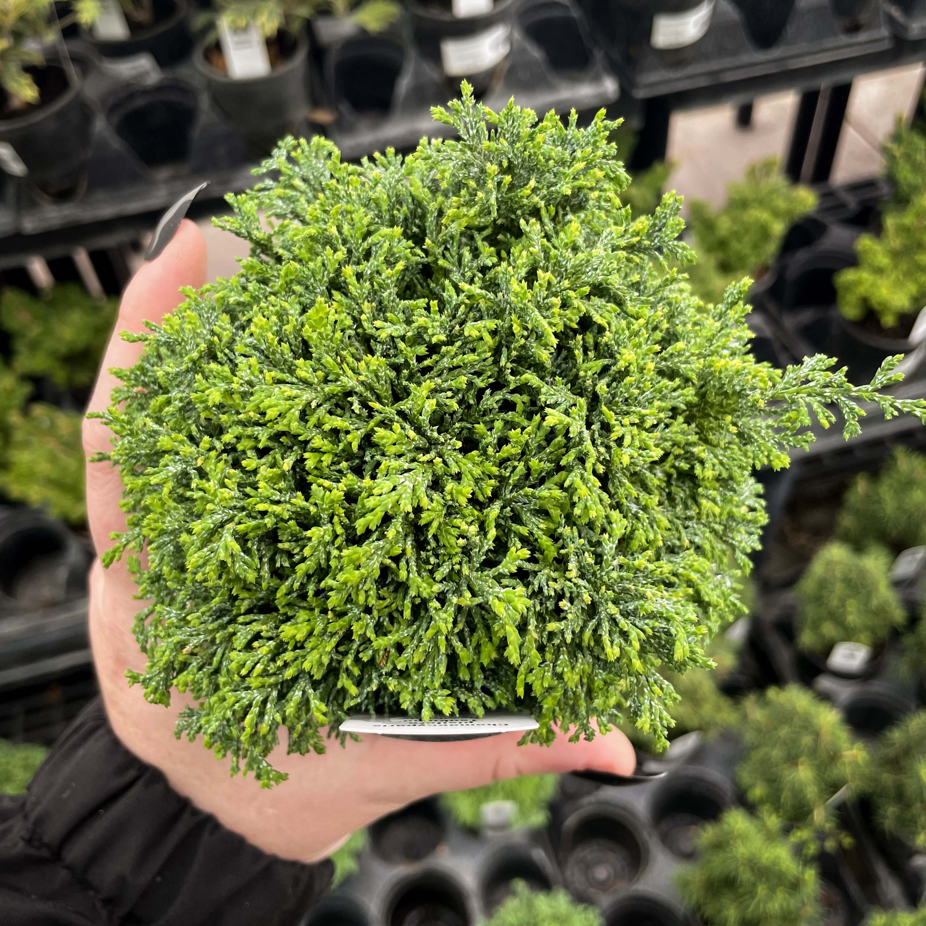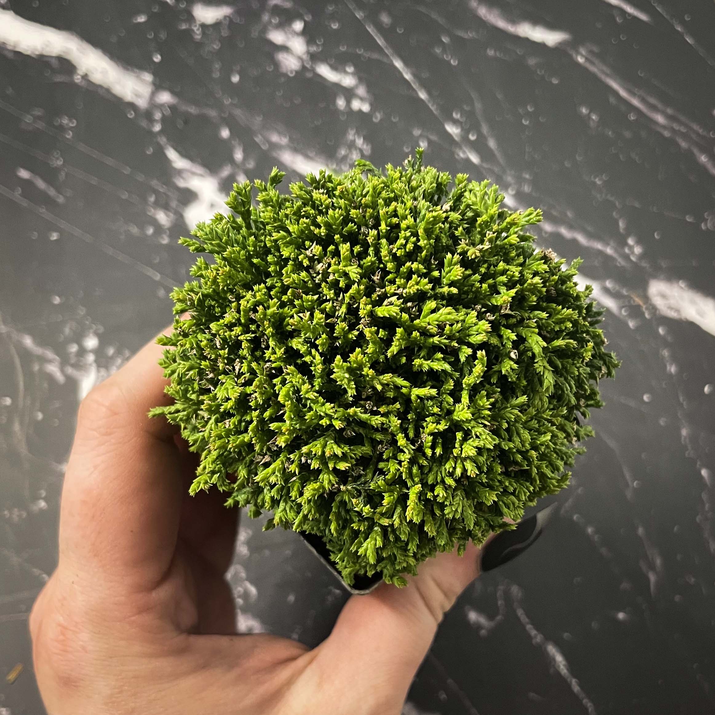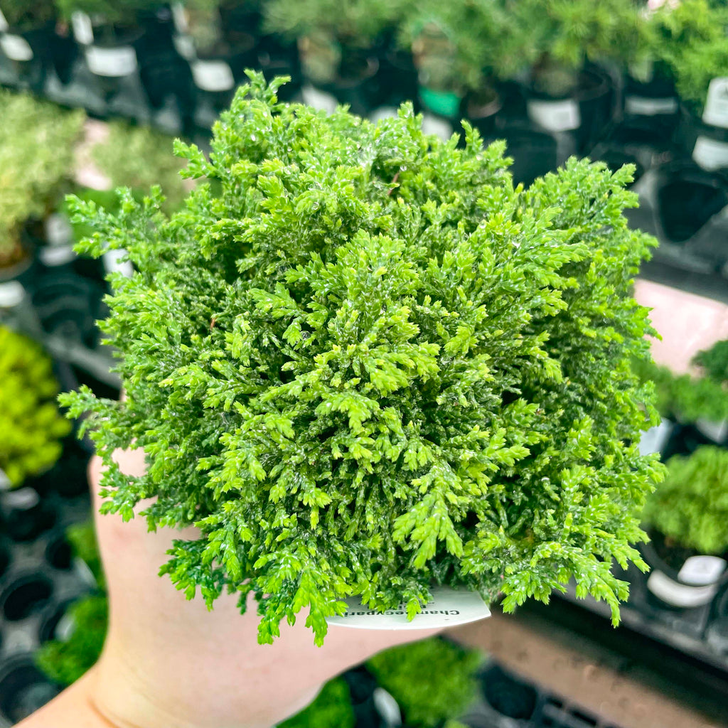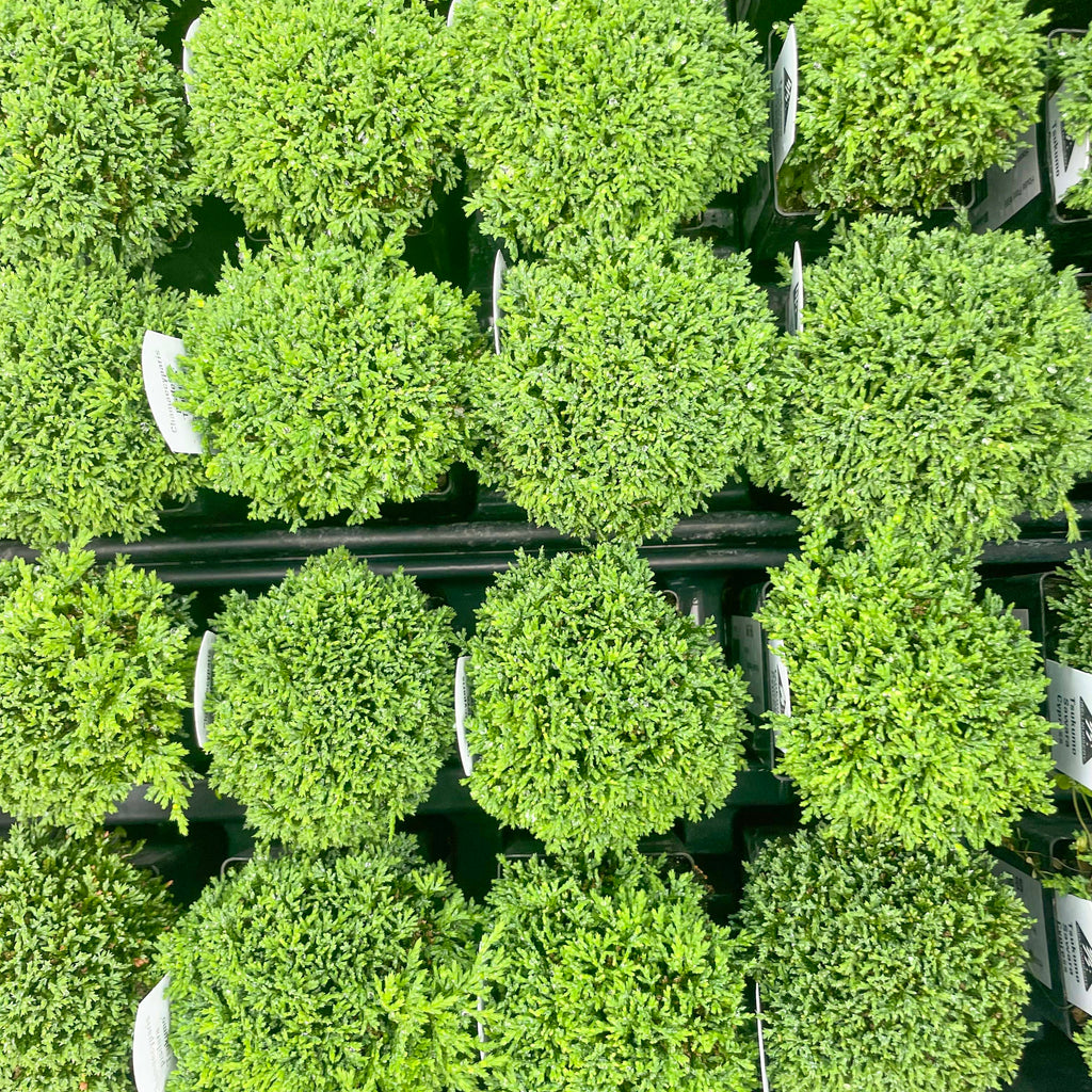 Chamaecyparis pisifera ‘Tsukumo’ is a diminutive conifer that forms a rounded bun reminiscent of a mossy green rock. Its dense, finely textured green foliage grows at an extremely slow pace, making it ideal for miniature or rock gardens where space is at a premium. This hardy, tough selection typically spreads wider than it is tall, creating a neat, cushion-like shape that remains manageable over time.
