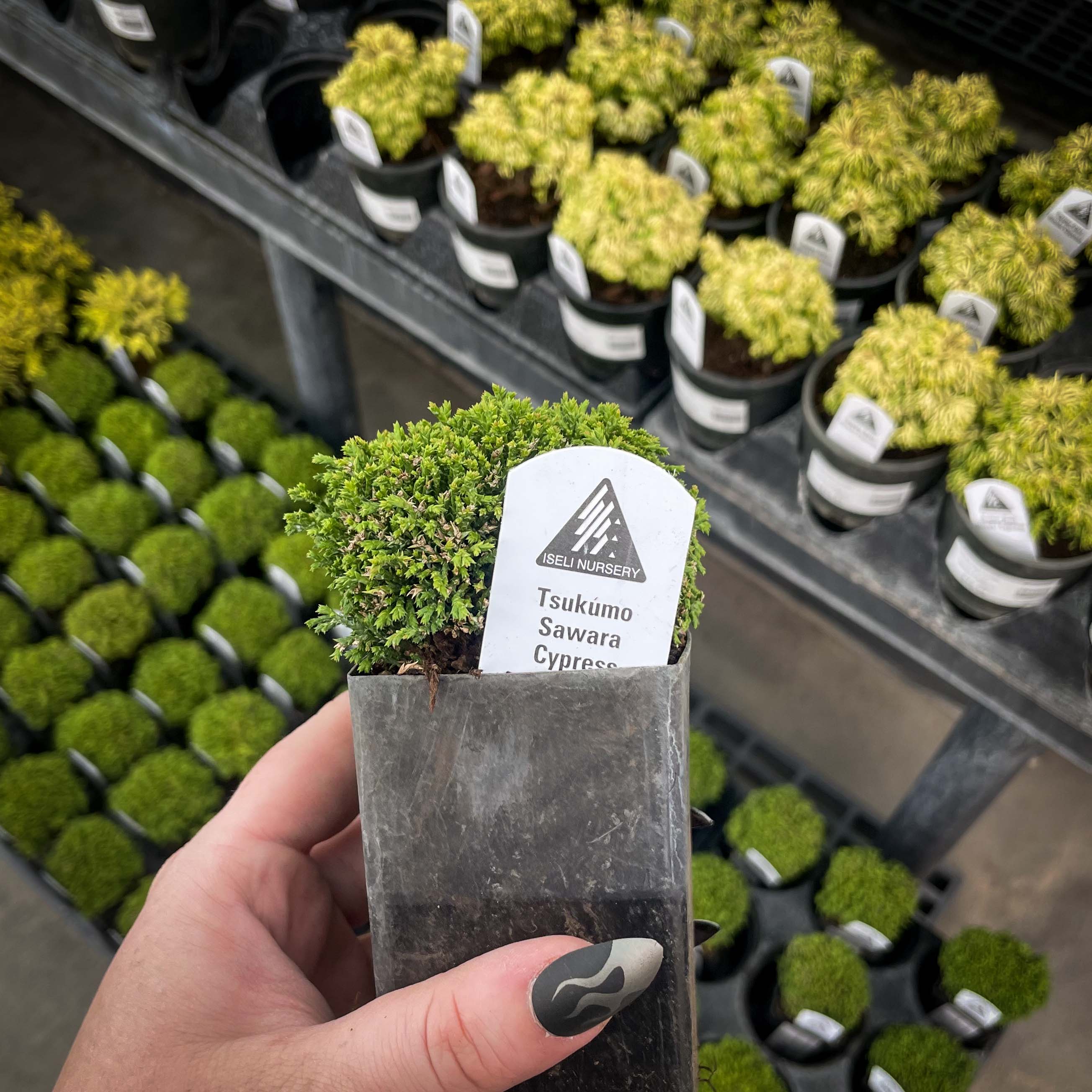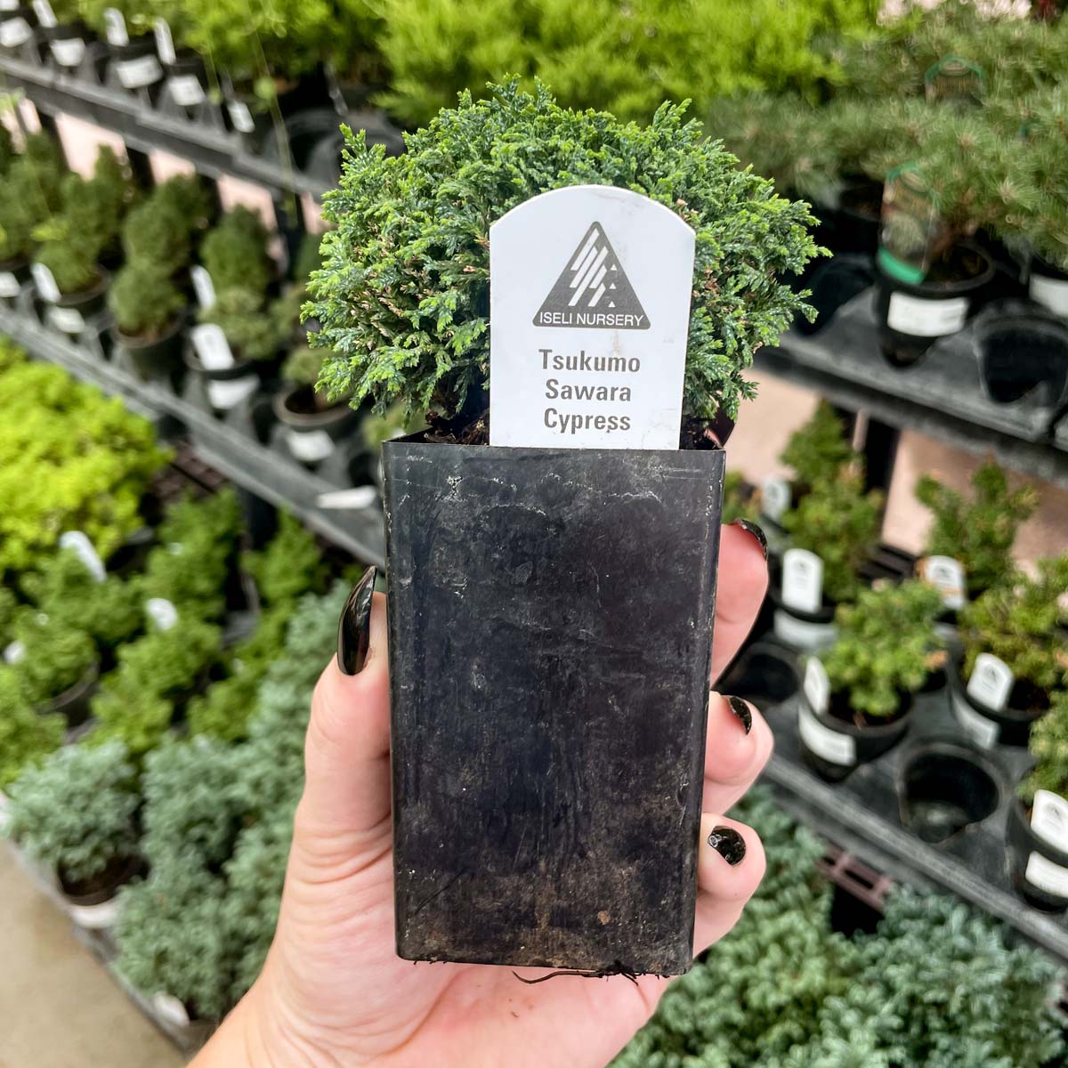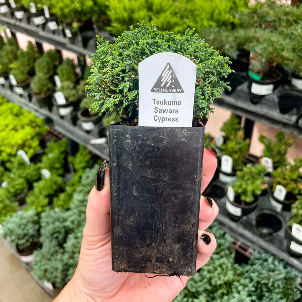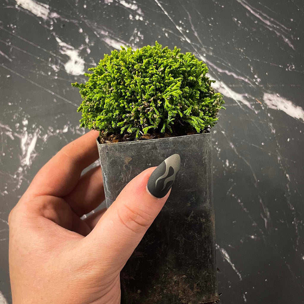 Chamaecyparis pisifera ‘Tsukumo’ is a diminutive conifer that forms a rounded bun reminiscent of a mossy green rock. Its dense, finely textured green foliage grows at an extremely slow pace, making it ideal for miniature or rock gardens where space is at a premium. This hardy, tough selection typically spreads wider than it is tall, creating a neat, cushion-like shape that remains manageable over time.